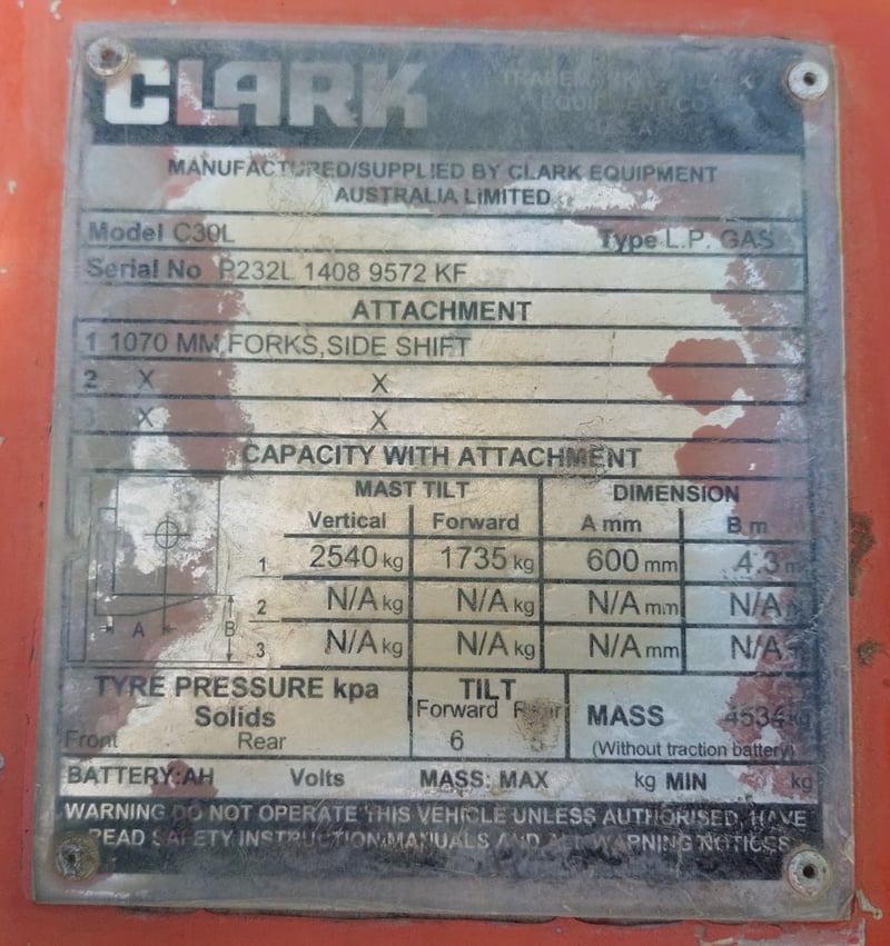 Circa 2005 Clark C30L Ride-on LPG Forklift