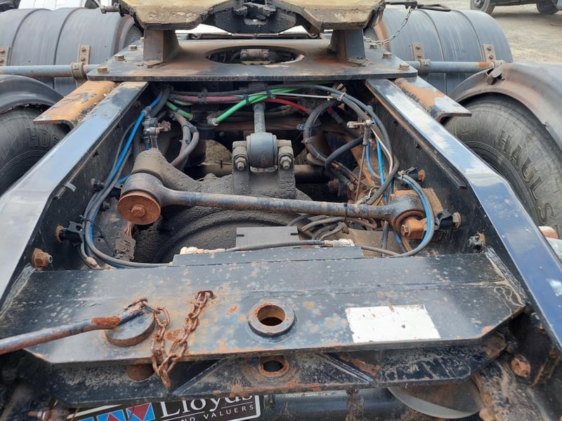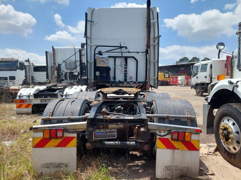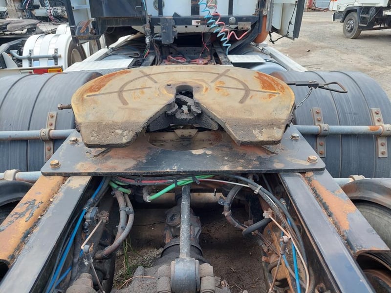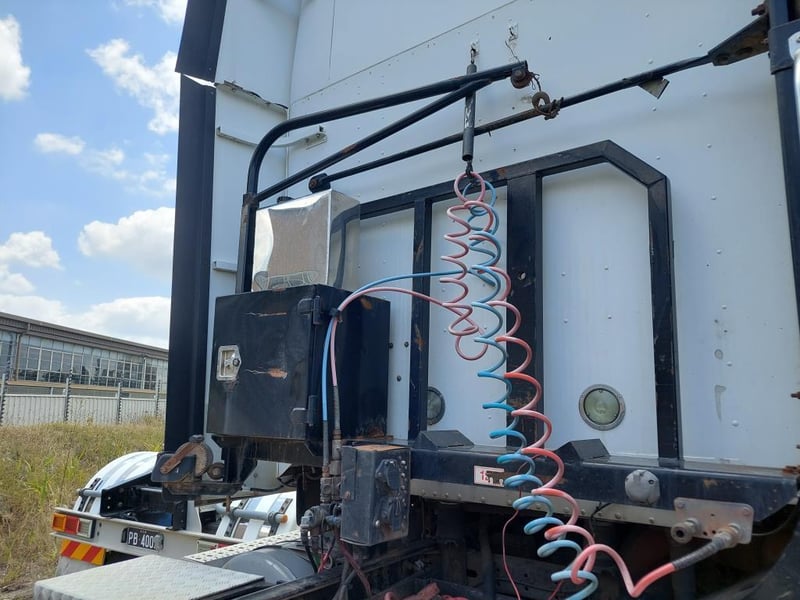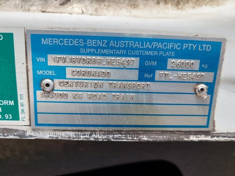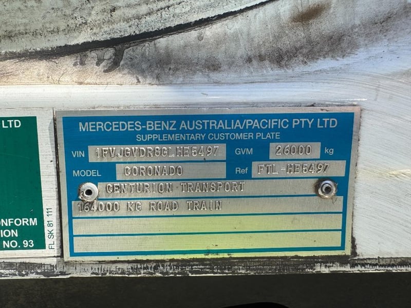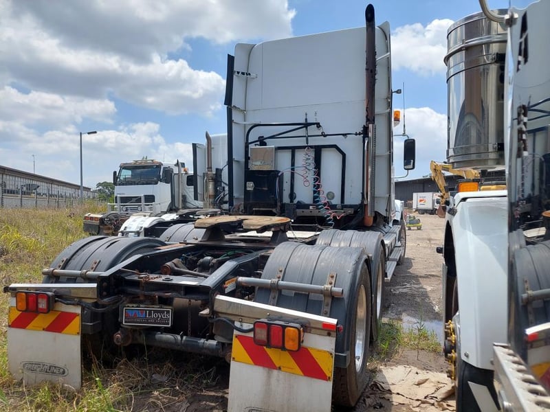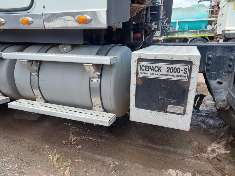 Description/extras: Tail shaft disconnected, does not build air. Holland airbag suspension, bonneted sleeper cabin with Icepack 2000-S air conditioning system, disc alloy rims, 3x 454L stainless steel diesel tanks, 1x 303L stainless steel diesel tank, stainless steel water tank, K-Hitch hitch, aero kit, K Craft painted bull bar with Kings LED driving lights, beacons