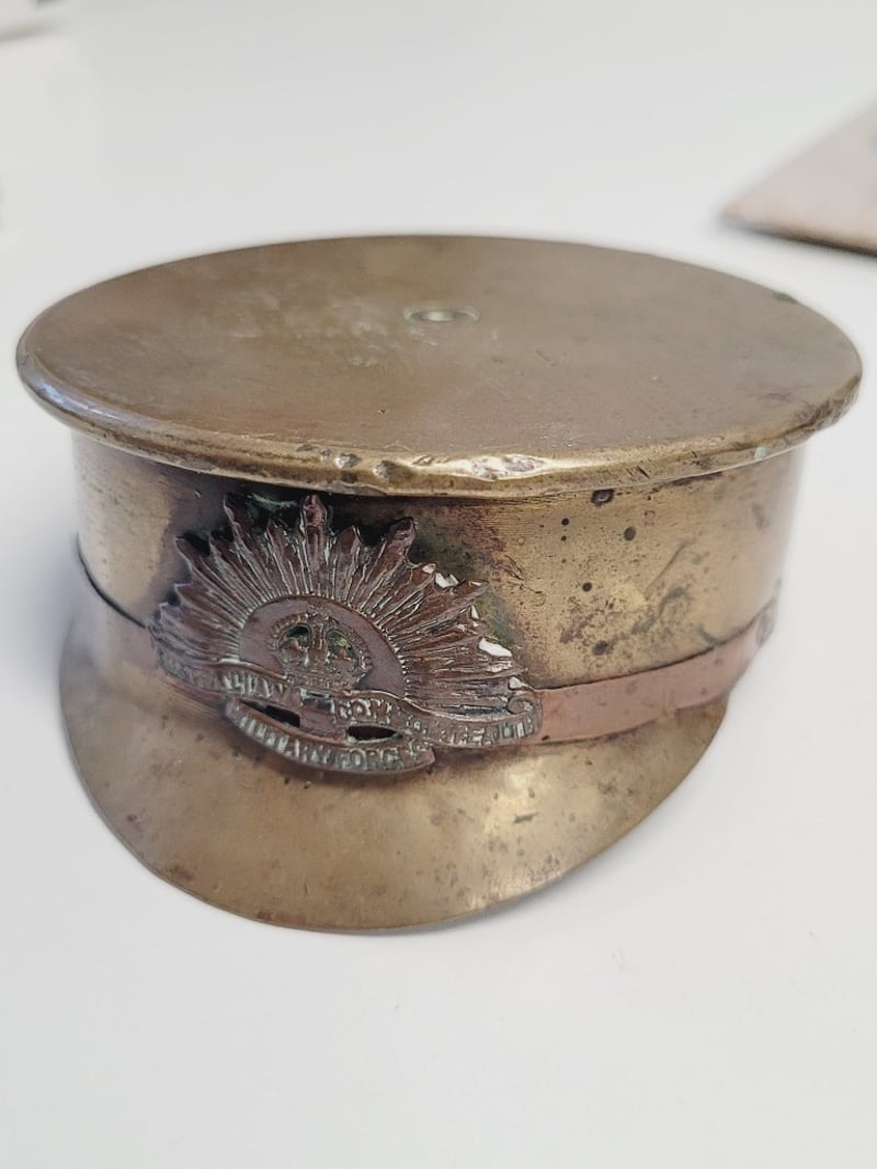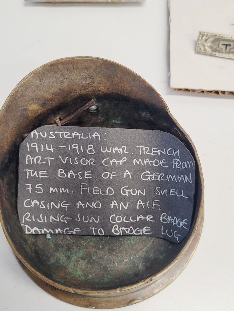 - 1914-1918 War Trench Art Visor Cap, Made From The Base Of A German 75Mm Field Gun Shell