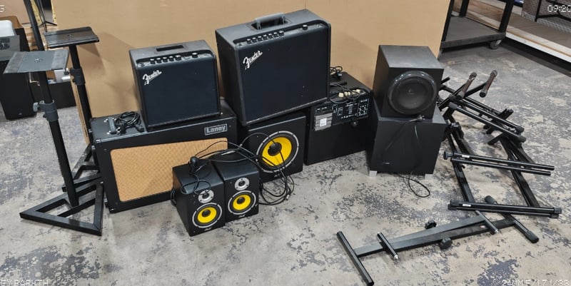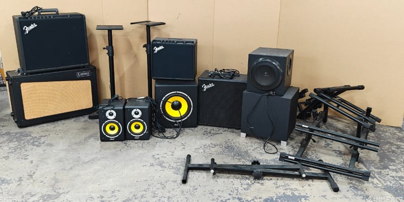 Audio equipment, Including Fender Guitar Amps, Laney Guitar Amp, Studio Monitors, Subwoofer, stands and more Condition unknown Sold as lot