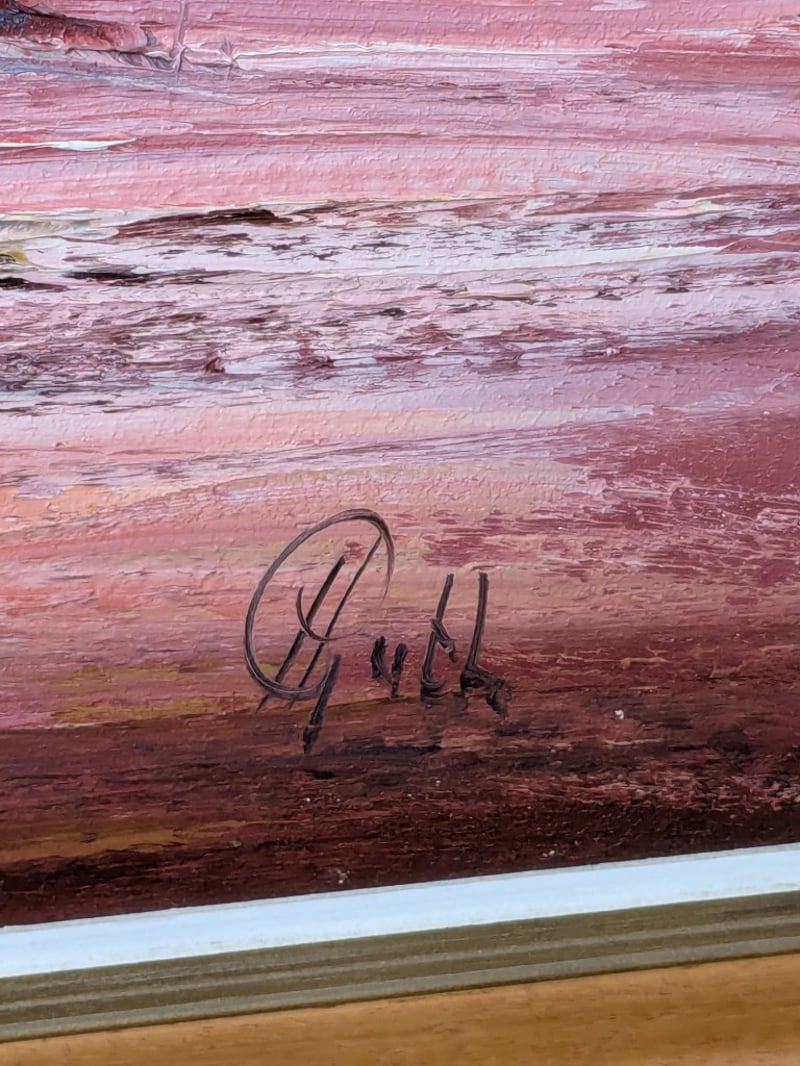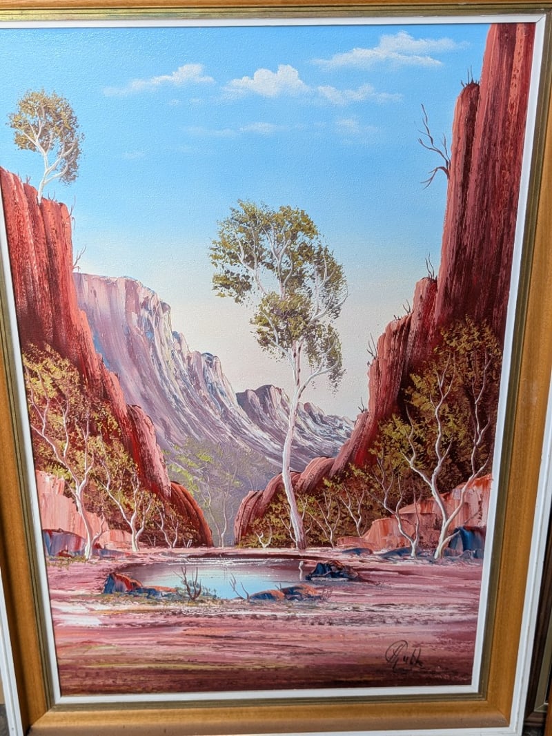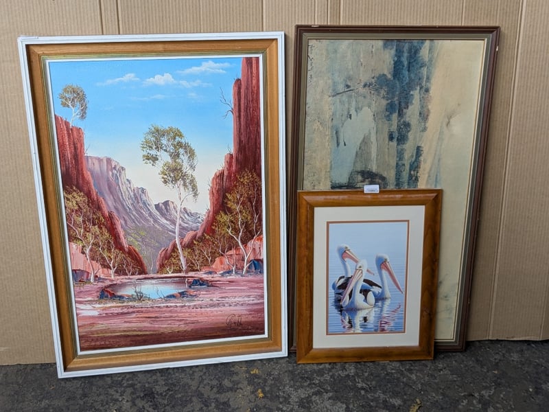 Artwork, including framed oil painting on board signed by artist and 2 x prints