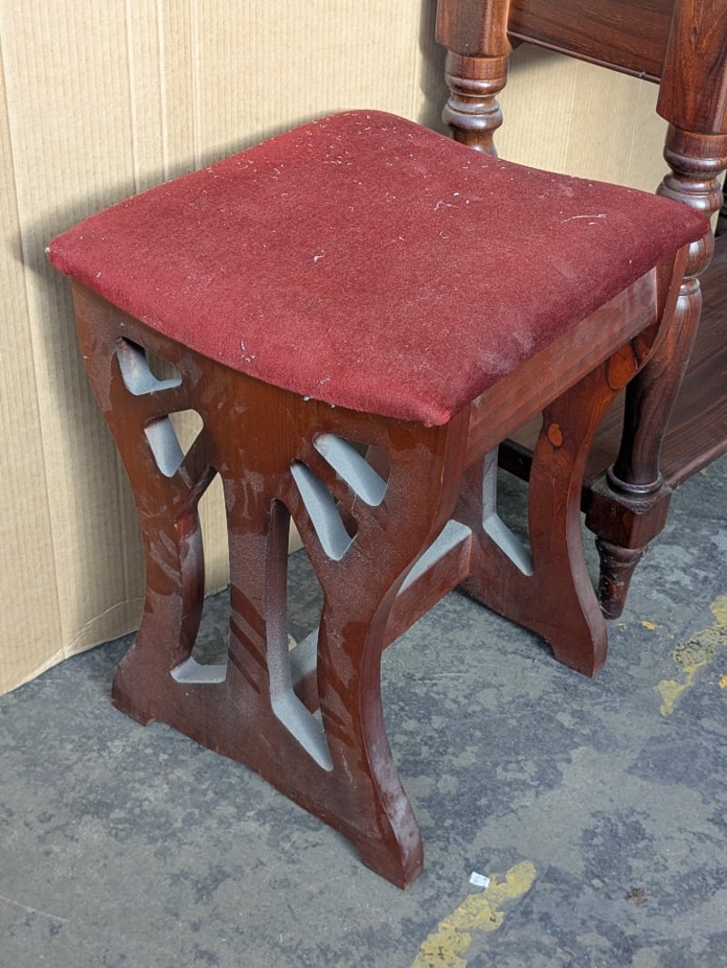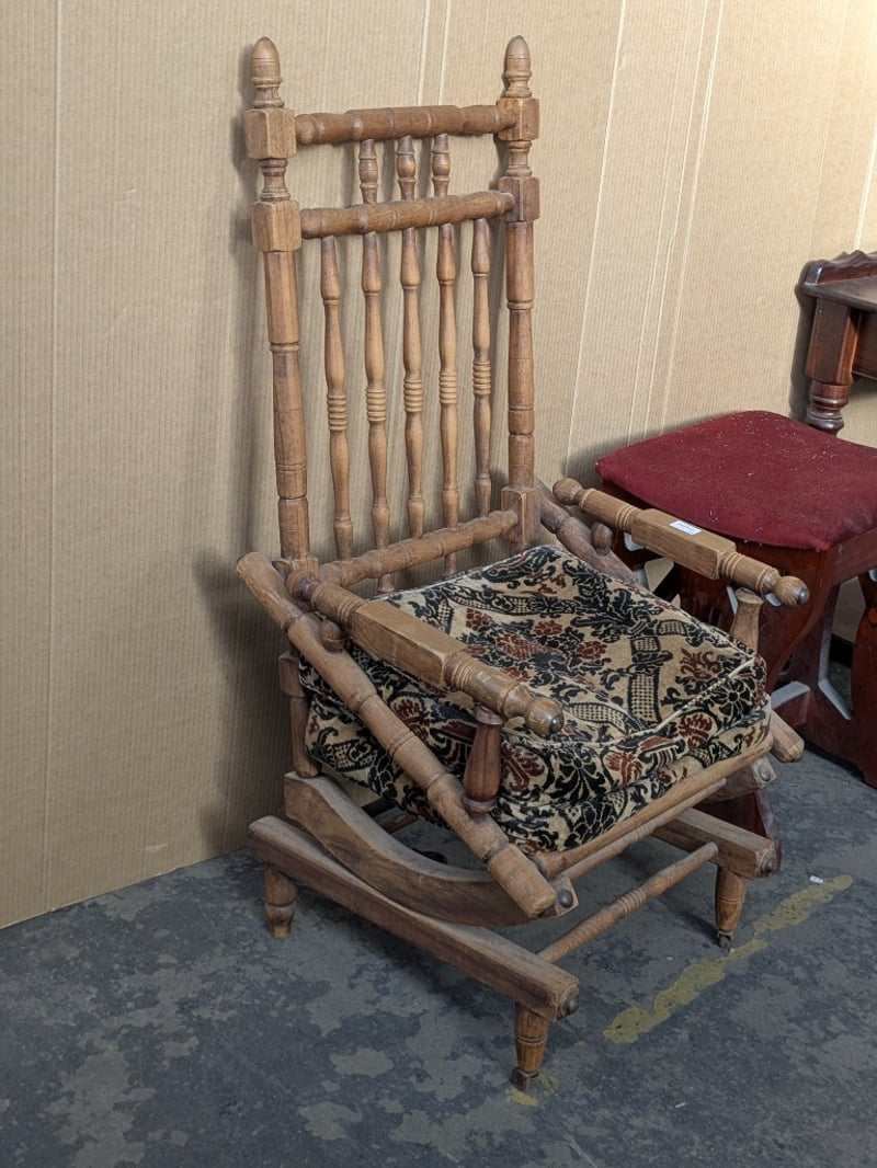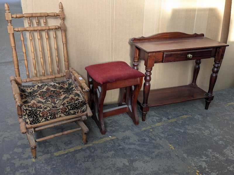 Furniture, including 1 x spring rocking chair, 1 x stool and 1 x timber style side board