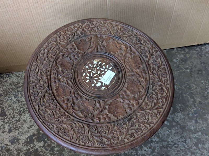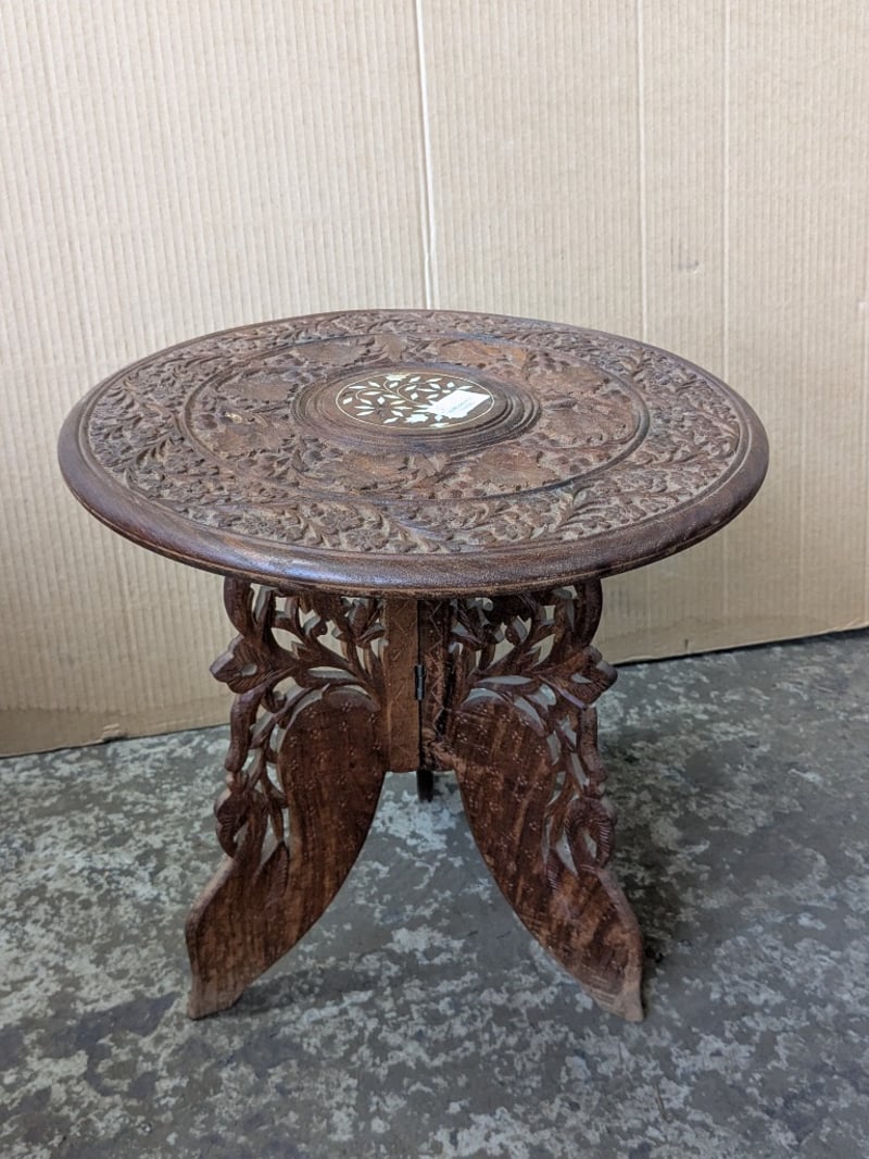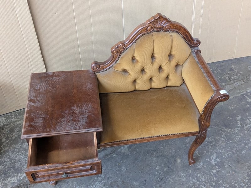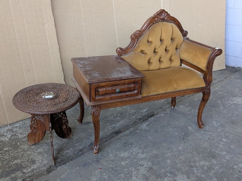 Furniture, including carved folding side table with inlay and button back telephone chair
