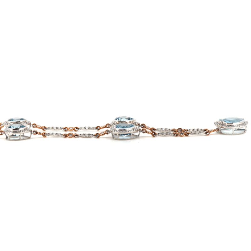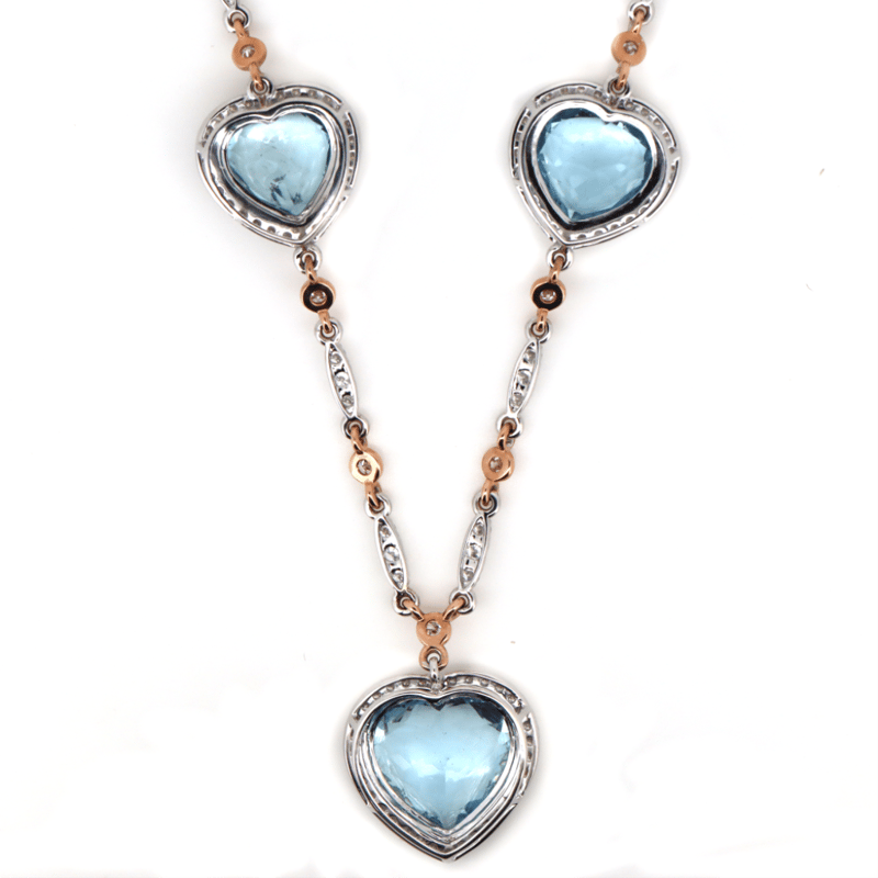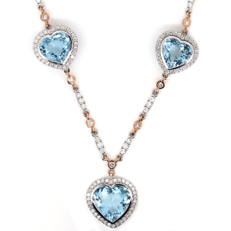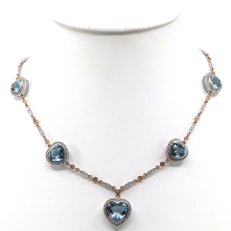 The Design Features, 5 Heart Cut, Weak Pale Blue, Aquamarines (25.38Ct Tsw, Eye Clean Clarity), Bezel Set. Decorating The Chain Are, 15 Round Brilliant Cut, Champagne Pink, Diamonds (0.78Ct Tdw, Si1-Si2 Clarity), Bezel/Bead Set. Additionally Decorating The Chain Are, 172 Round Brilliant Cut, Diamonds (3.28Ct Tdw, G-H Colour, Si1-Si2 Clarity), Bezel/Bead Set. Total Length Is 50Cm. Total Weight Is 27.31 Grams.