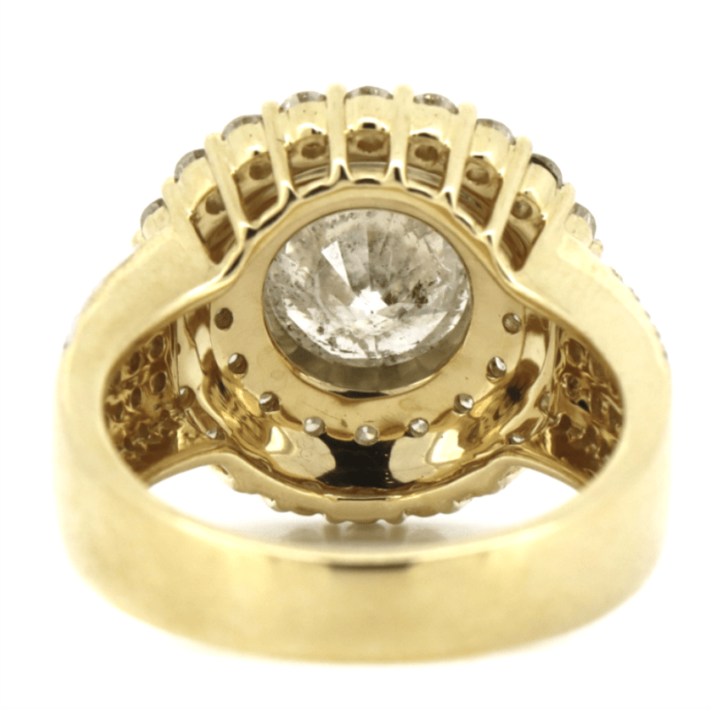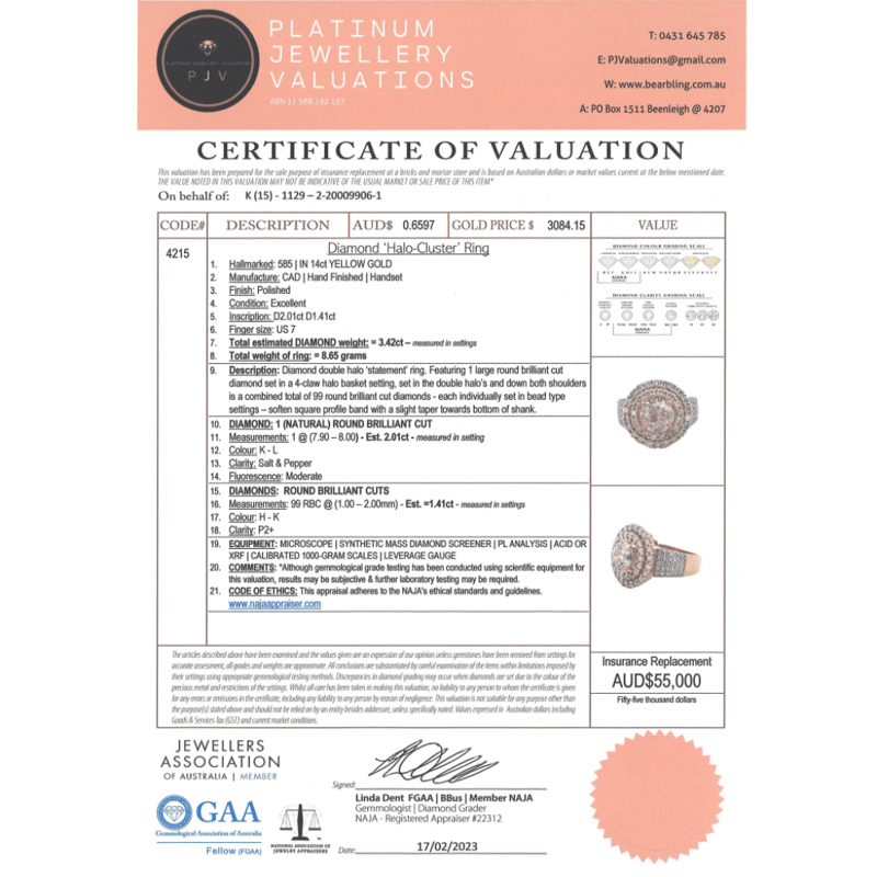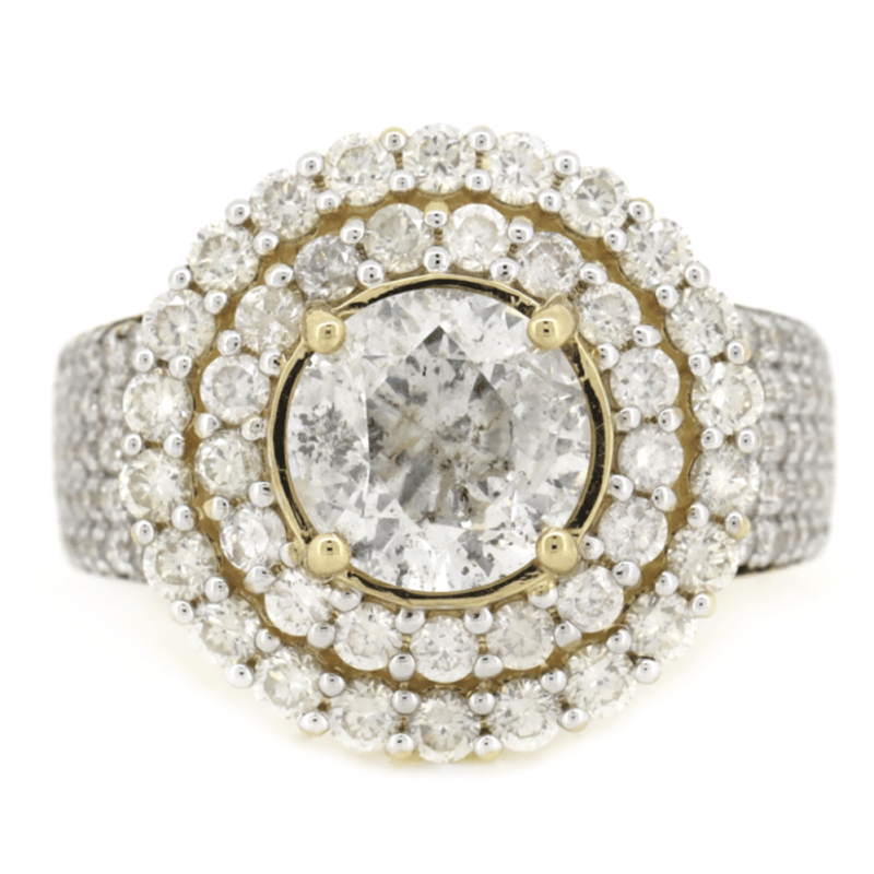 The Centre Features, One Round Brilliant Cut, Diamond (2.01Ct, K-L Colour, Salt And Pepper Clarity), 4 Claw Set. Surrounding The Centre In A Double Halo And Decorating The Band Are, 99 Round Brilliant Cut, Diamonds (1.41Ct Tdw, H-K Colour, P2+ Clarity), Bead Set. Ring Size N 1/2.