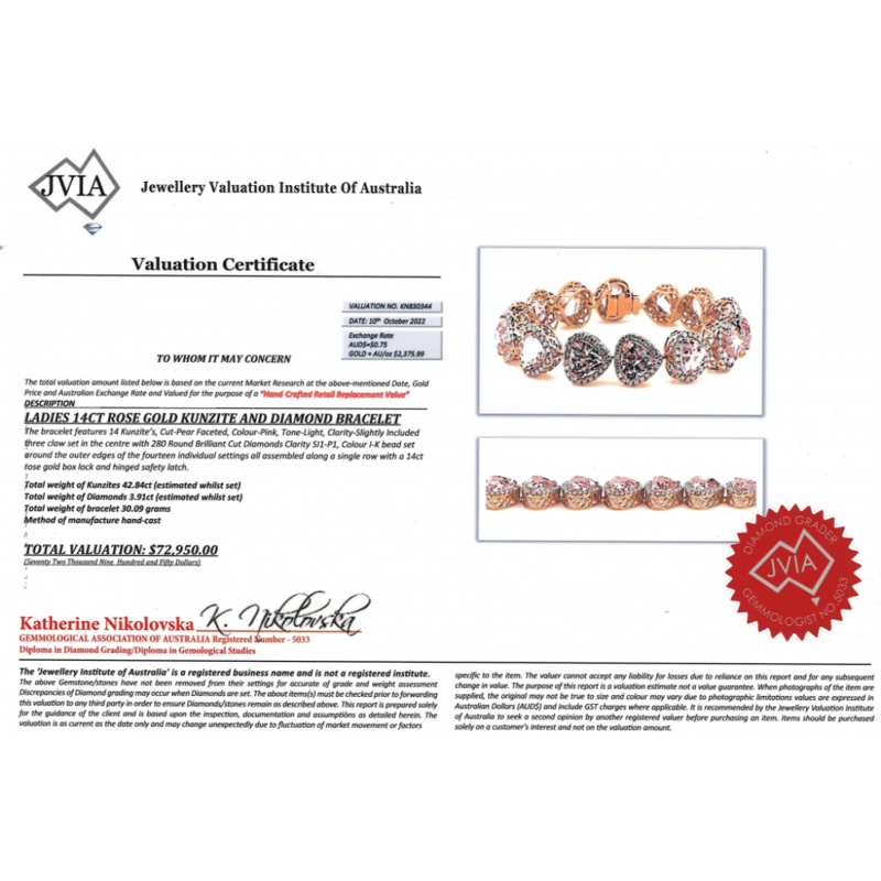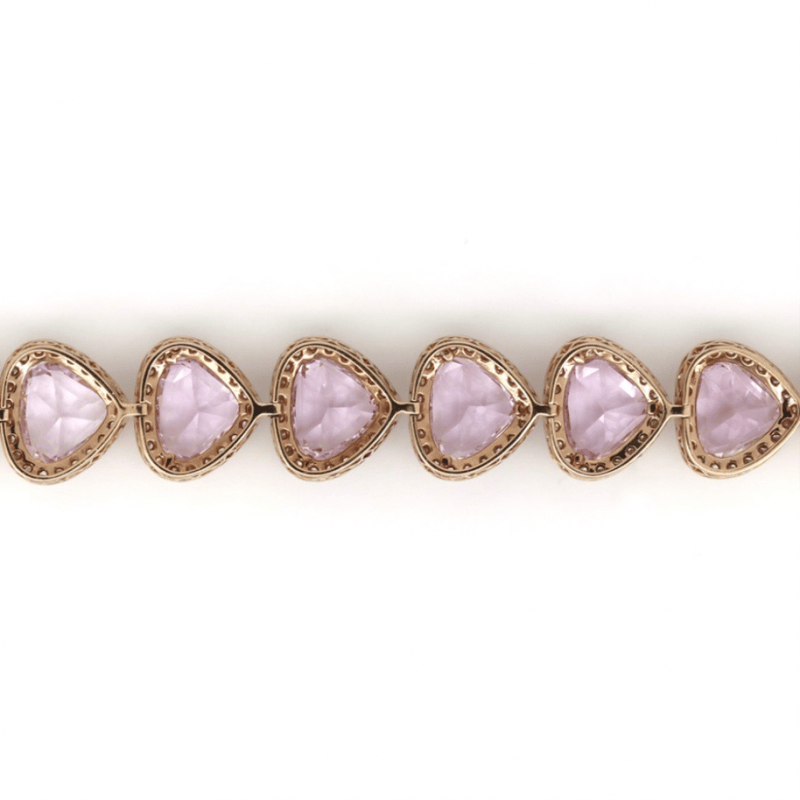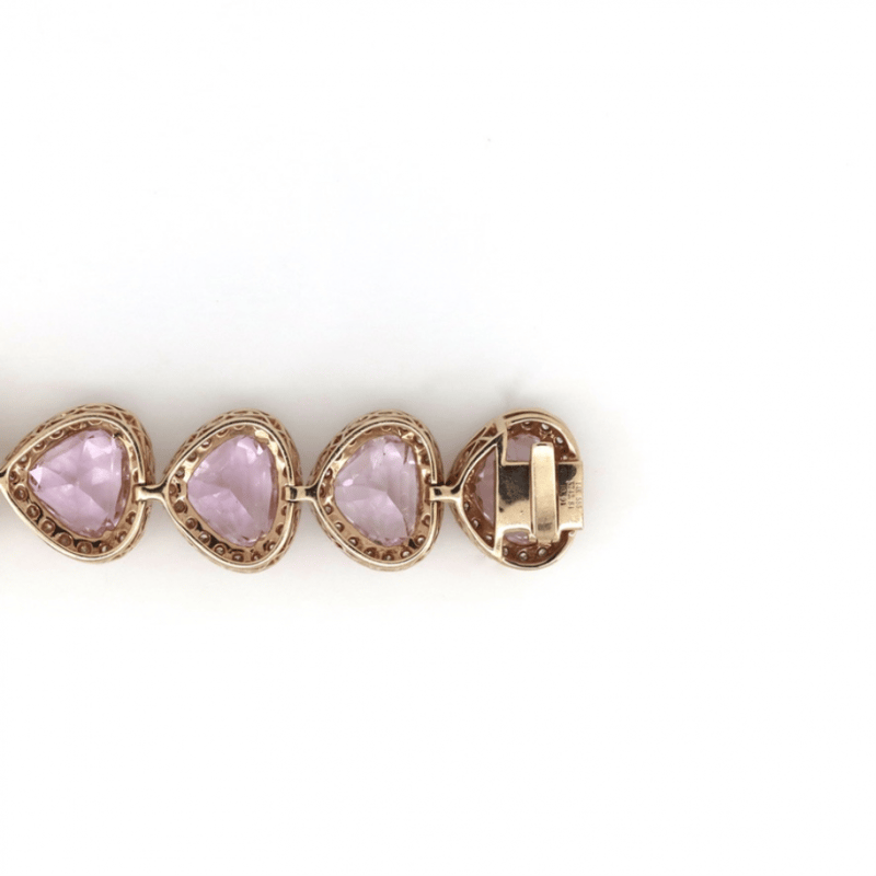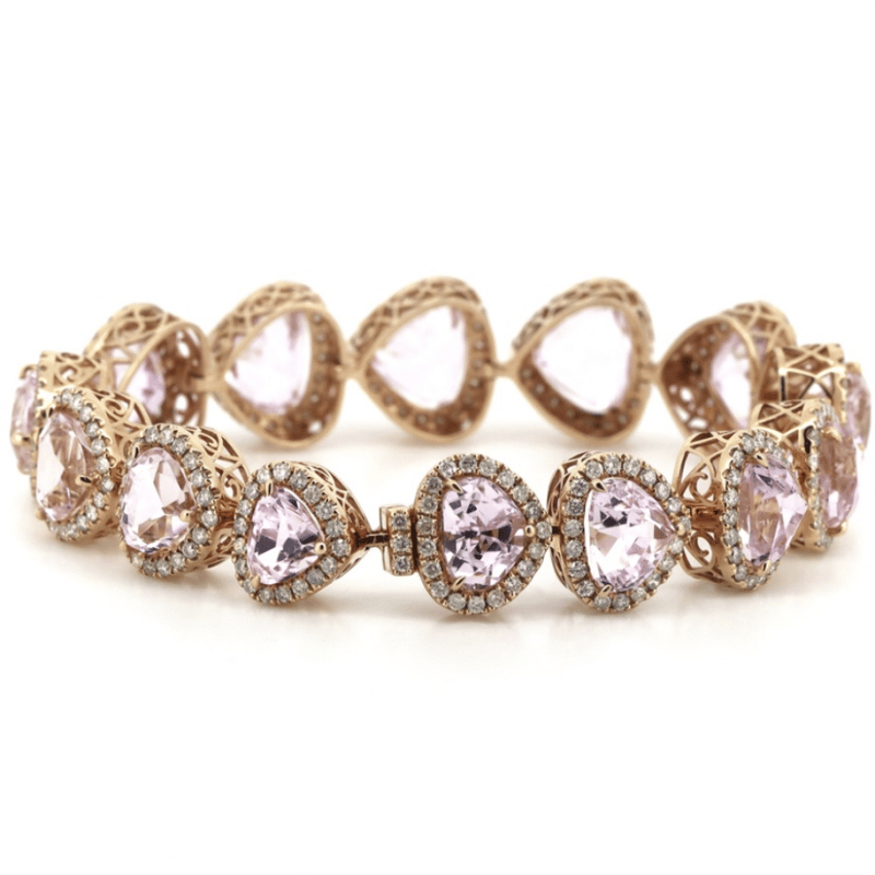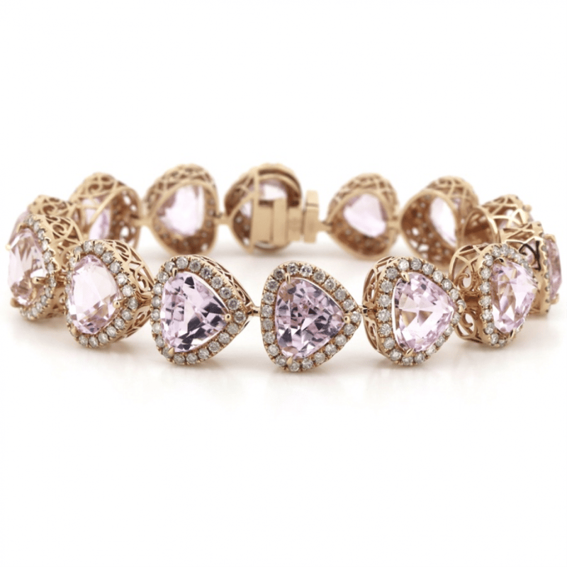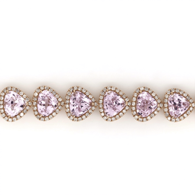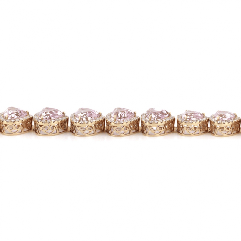 The Design Features, 14 Pear Faceted Cut, Light Pink, Kunzites (42.84Ct Tsw, Slightly Included), Claw Set. Surrounding The Stones In Halos Are, 280 Round Brilliant Cut, Diamonds (3.91Ct Tdw, I-K Colour, Si1-P1 Clarity), Bead Set. The Bracelet Features A Box Lock With Safety Latch. Length Is 17.50Cm.