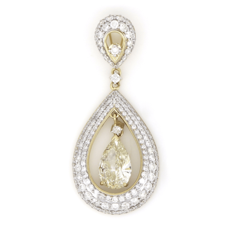 The Centre Features, One Pear Faceted Cut, Light Fancy Yellow, Diamond (2.05Ct, I1 Clarity), Claw Set. Encompassing The Design Are, 171 Round Brilliant Cut, Diamonds (1.67Ct Tdw, G-H Colour, Si-I1 Clarity), Claw Set.