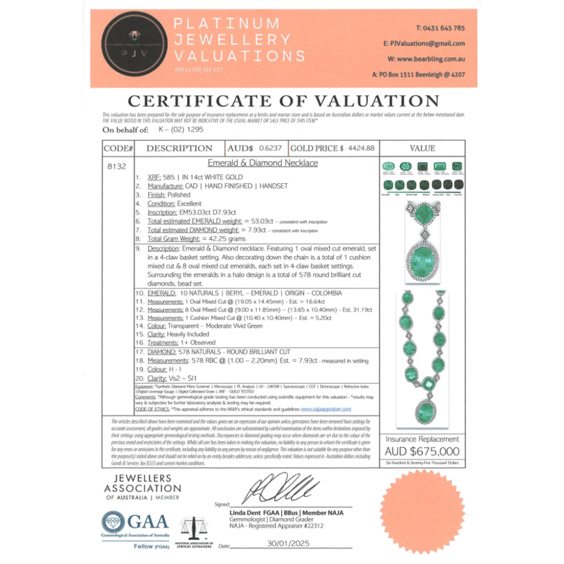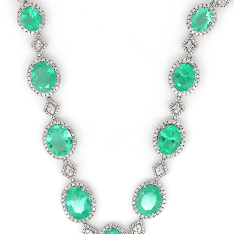 The Design Features, 10 Oval/Cushion Cut, Moderate Vivid Green Colombian Emeralds (53.03Ct Tsw, Heavily Included, Treated), 4 Claw Basket Set. Decorating Each Emerald In A Halo And The Chain Are, 578 Round Brilliant Cut, Diamonds (7.93Ct Tdw, H-I Colour, Vs2-Si1 Clarity), Bead Set. The Necklace Is 45Cm.