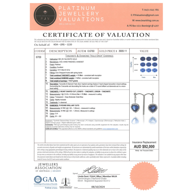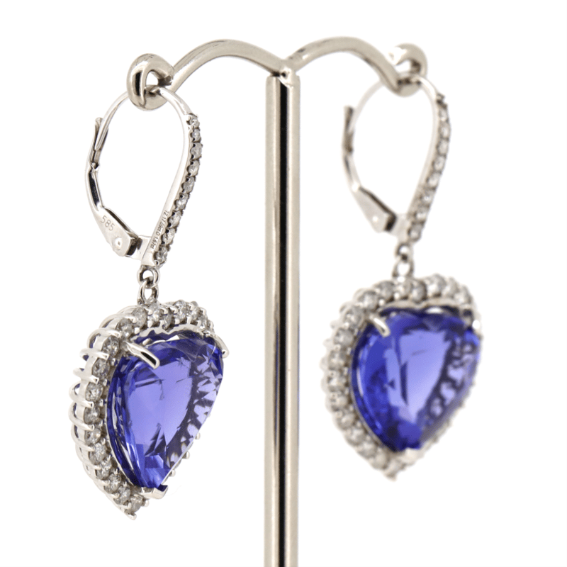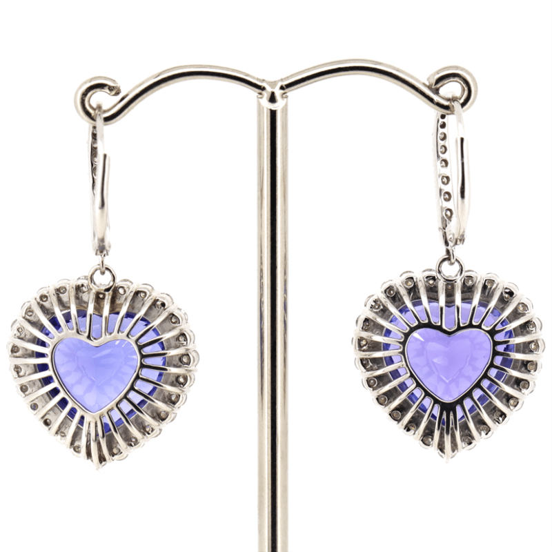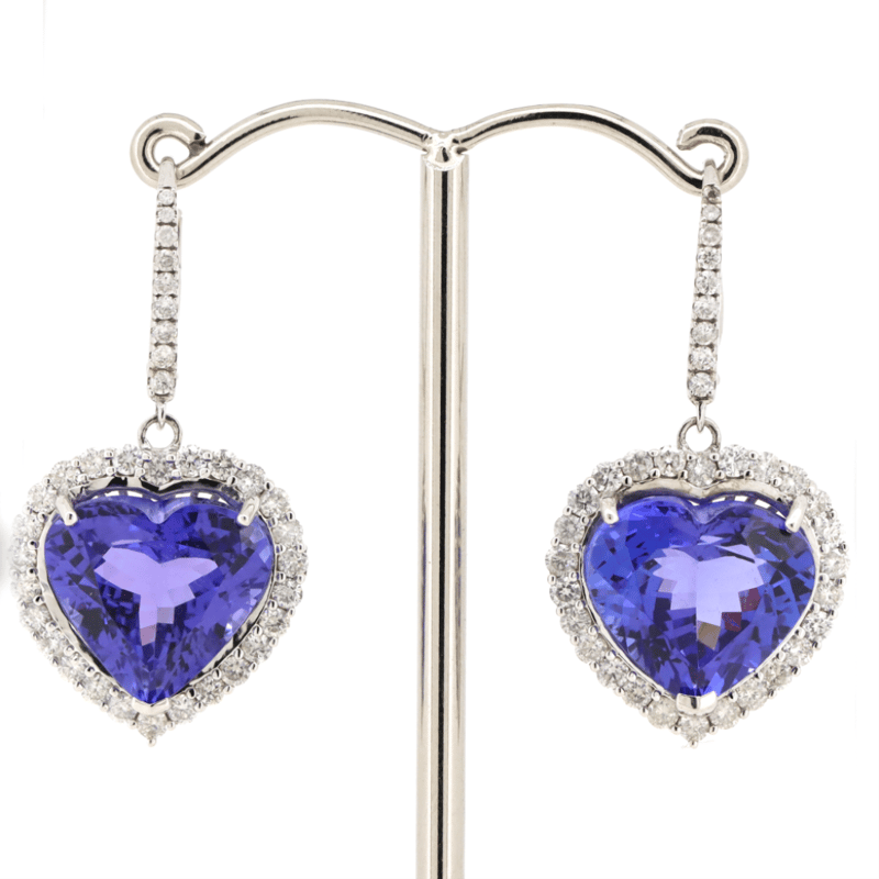 The Centres Feature, 2 Heart Shaped, Deep Moderate Violet-Blue, Tanzanites (17.09Ct Tsw, Slightly Included), V Prong/Claw Set. Surrounding The Centres In Halos And Decorating The Hooks Are, 70 Round Brilliant Cut, Diamonds (1.67Ct Tdw, G-H Colour, Si1-Si2 Clarity), Bead Set. The Earrings Have Shepherds Hooks.