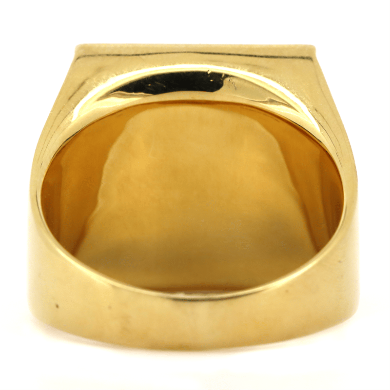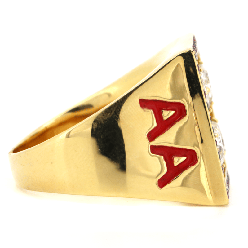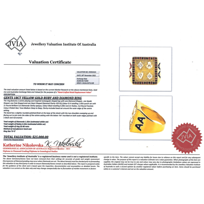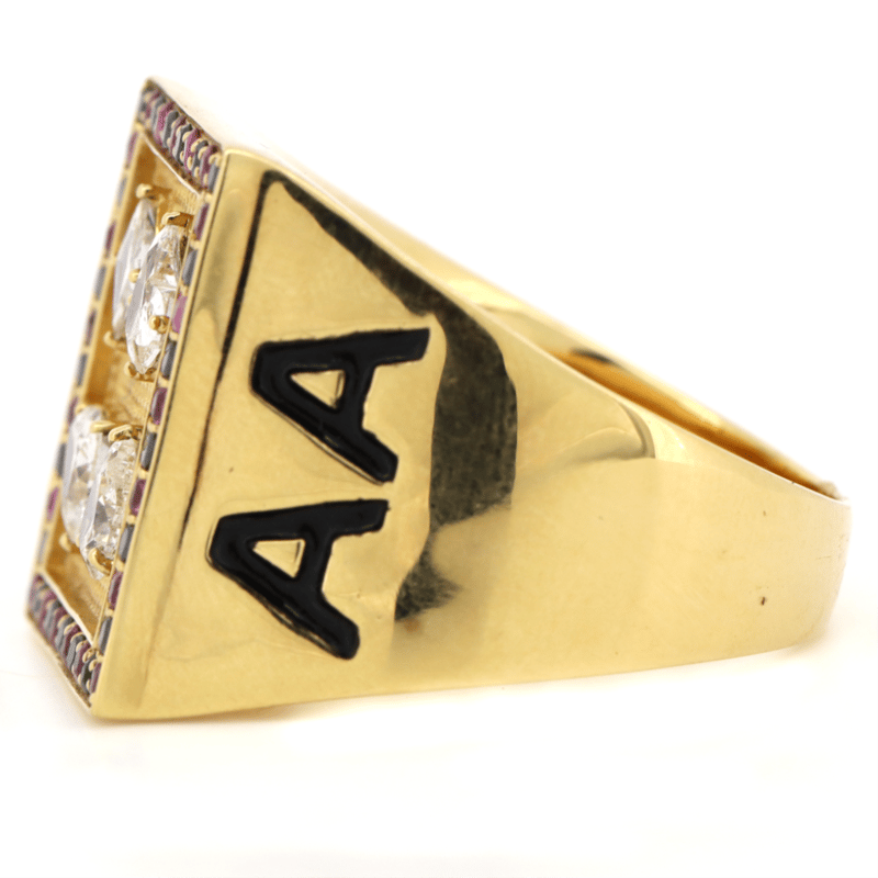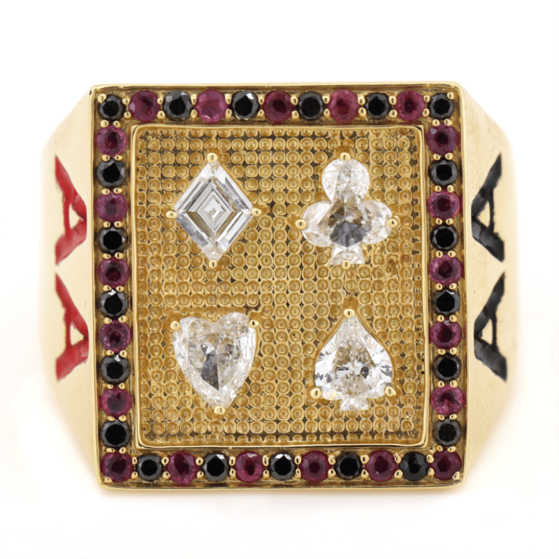 The Centre Features, One Diamond, One Spade, One Club And One Heart Shape, Diamond (1.03Ct Tdw, G-H Colour, Vs2-Si1 Clarity), Claw Set. Decorating The Border Of The Design Are, 21 Round Cut, Pinkish-Red, Rubies (0.32Ct Tsw, Moderately Included), Punch/Bead Set. Alternating Between Are, 21 Round Brilliant Cut, Black Diamonds (0.29Ct Tdw, Opaque), Bead/Punch Set. The Letters “Aa” Are Inscribed On Either Shoulder In Black And Red Enamel. Total Item Weight Is 22.46 Grams. Ring Size Z+2.