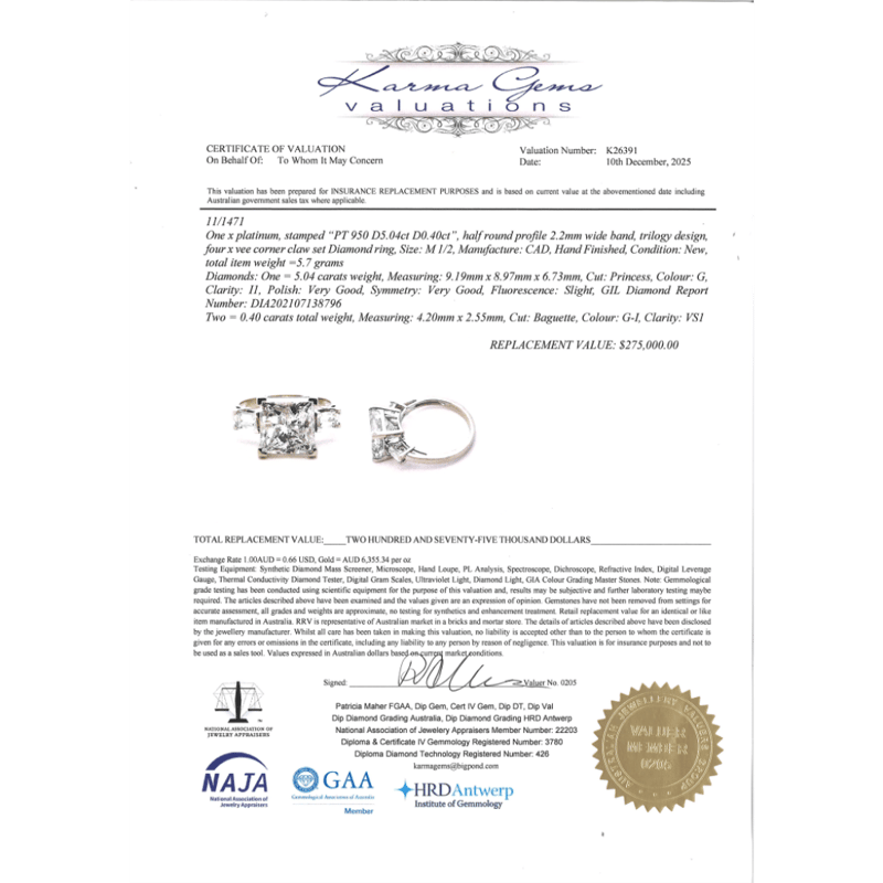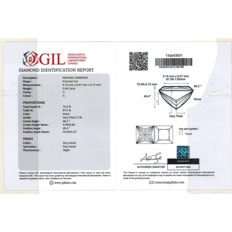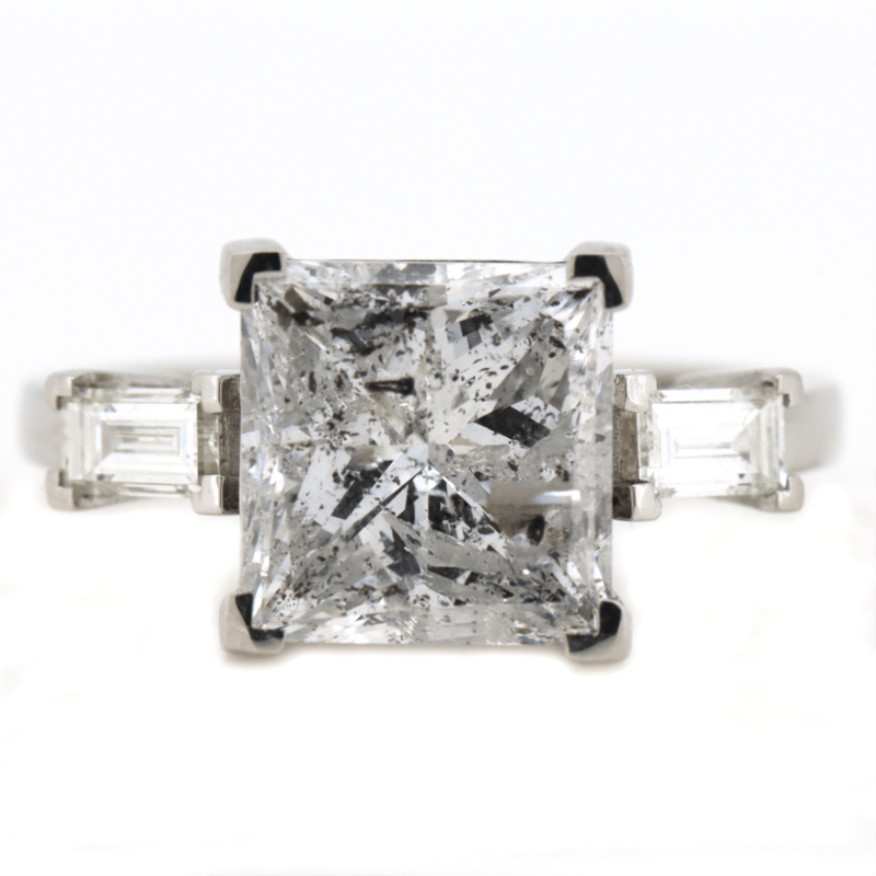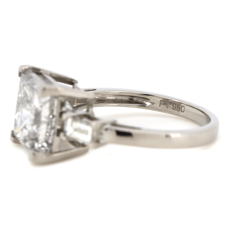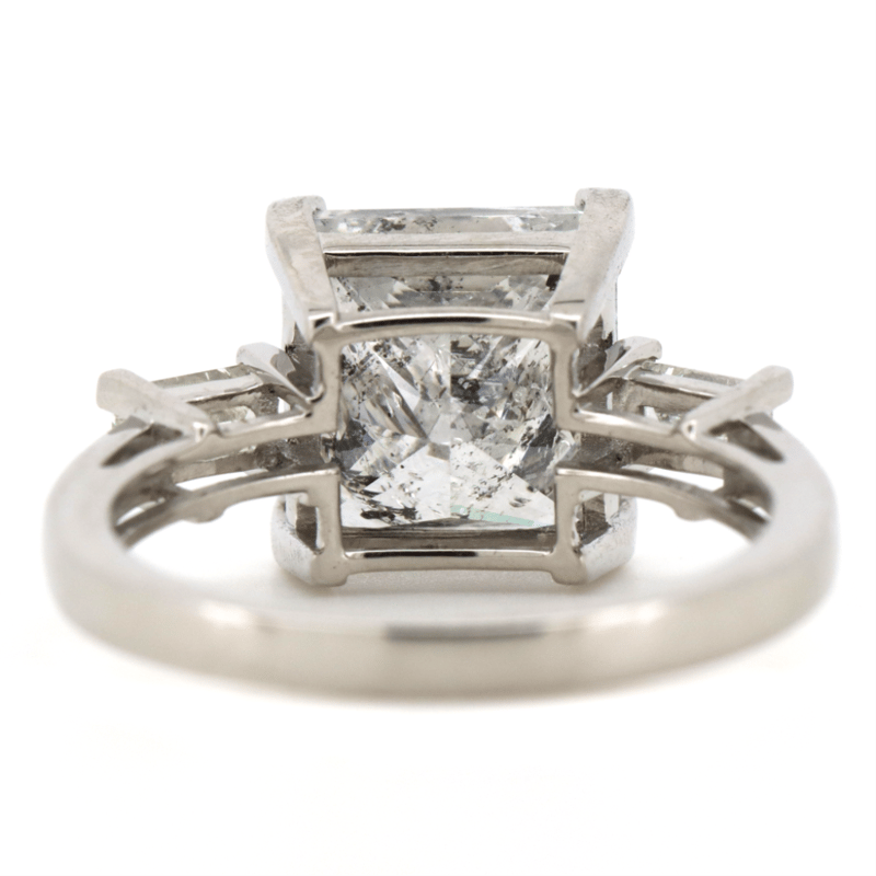 The Centre Features, One Princess Cut, Diamonds (5.04Ct, G Colour, I1 Clarity, Gil Report No: Dia202107138796), Vee Corner Claw Set. Flanking The Centre Are, 2 Baguette Cut, Diamonds (0.40Ct Tdw, G-I Colour, Vs1 Clarity), Vee Corner Claw Set. Ring Size M 1/2.