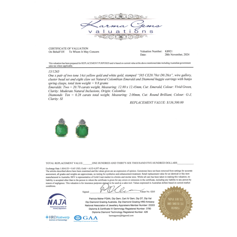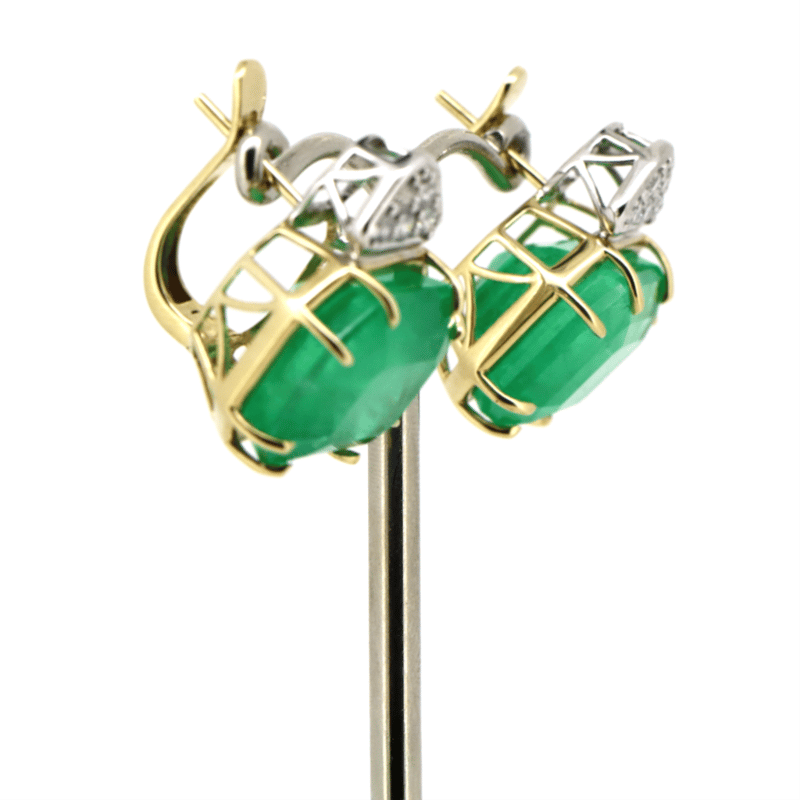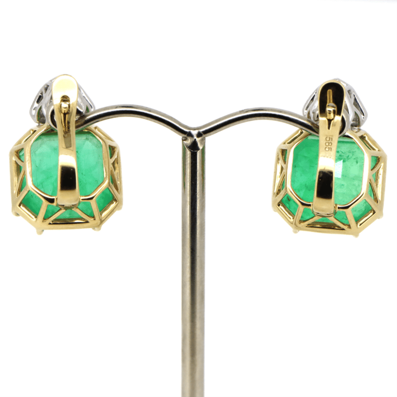 14K YELLOW/WHITE GOLD, 20.70CT TSW COLOMBIAN EMERALD AND DIAMOND, DROP EARRINGS.