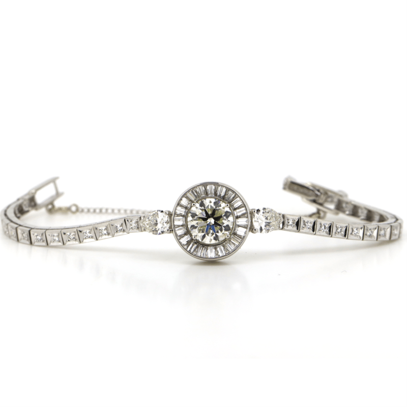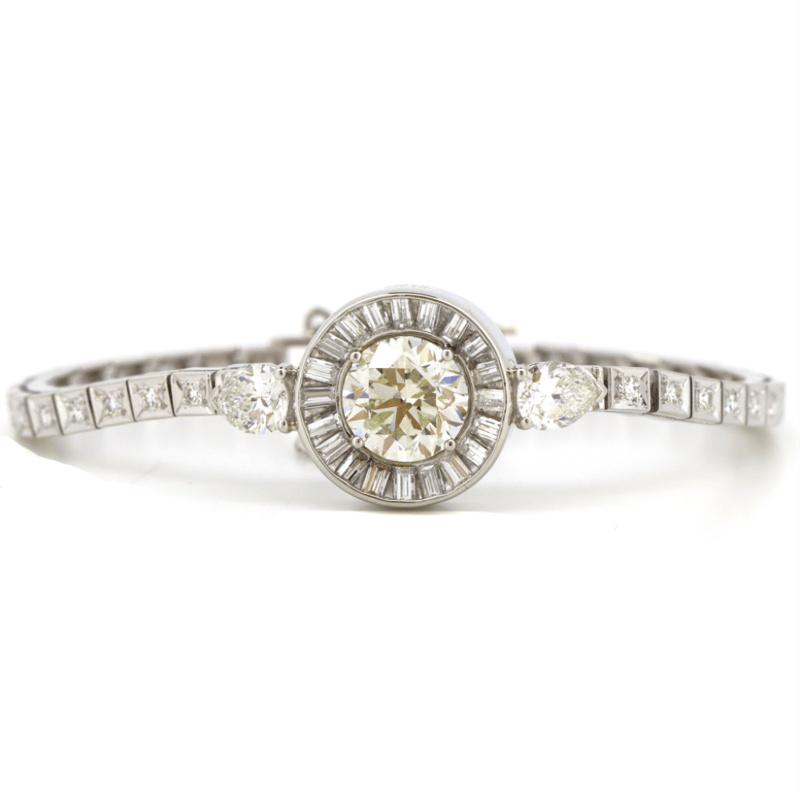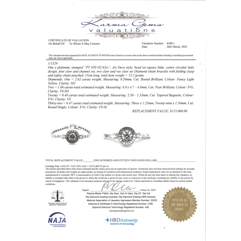 The Centre Features, One Round Brilliant Cut, Fancy Light Yellow Diamond (2.62Ct, Si2 Clarity), Claw Set. Encompassing The Centre Diamond And Decorating The Shoulders Are, 2 Pear Brilliant Cut, Diamonds (1.06Ct Tdw, F-G Colour, Vs-Si1 Clarity), Claw Set. Encompassing The Centre In A Halo Are, 20 Tapered Baguette Cut, Diamonds (0.48Ct Tdw, F-G Colour, Vs Clarity), Channel Set. Decorating The Bracelet Are, 32 Round Single Cut, Diamonds (0.47Ct Tdw, F-G Colour, Vs-Si1 Clarity), Vee Claw. The Bracelet Features A Folding Clasp And Has An Attached Safety Chain.