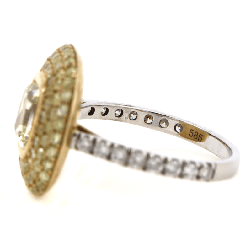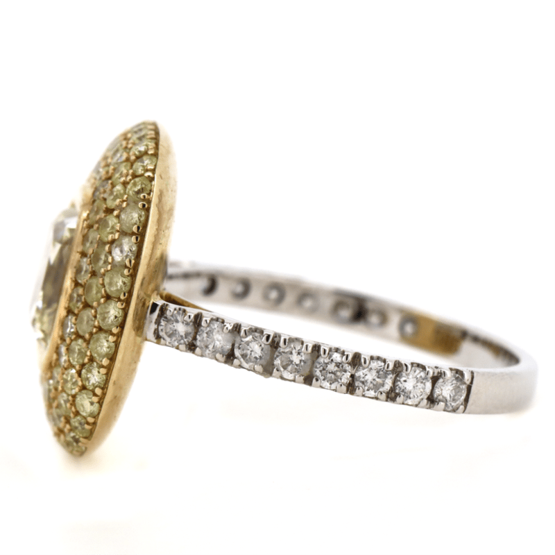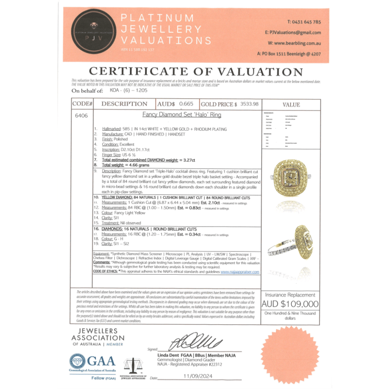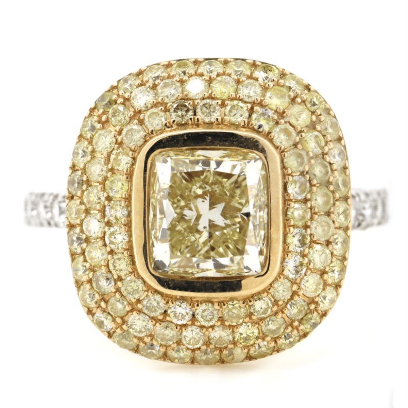 The Centre Features, One Cushion Cut And 84 Round Brilliant Cut, Fancy Light Yellow, Diamonds (2.10Ct Tdw, Si1 Clarity), Micro-Bead/Bezel Set In Yellow Gold. Decorating The Band Are, 16 Round Brilliant Cut, Diamonds (1.17Ct Tdw, G-H Colour, Si1-Si2 Clarity) Pip-Claw Set. Ring Size M 1/2.