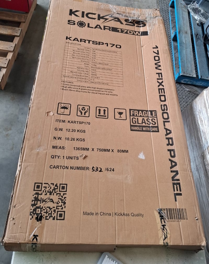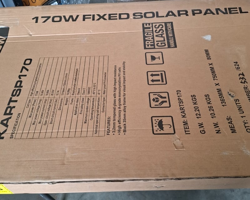 Boxed 2V 170W Fixed Solar Panel, Glass Roof Top. Box has visible damageInspection Recommended