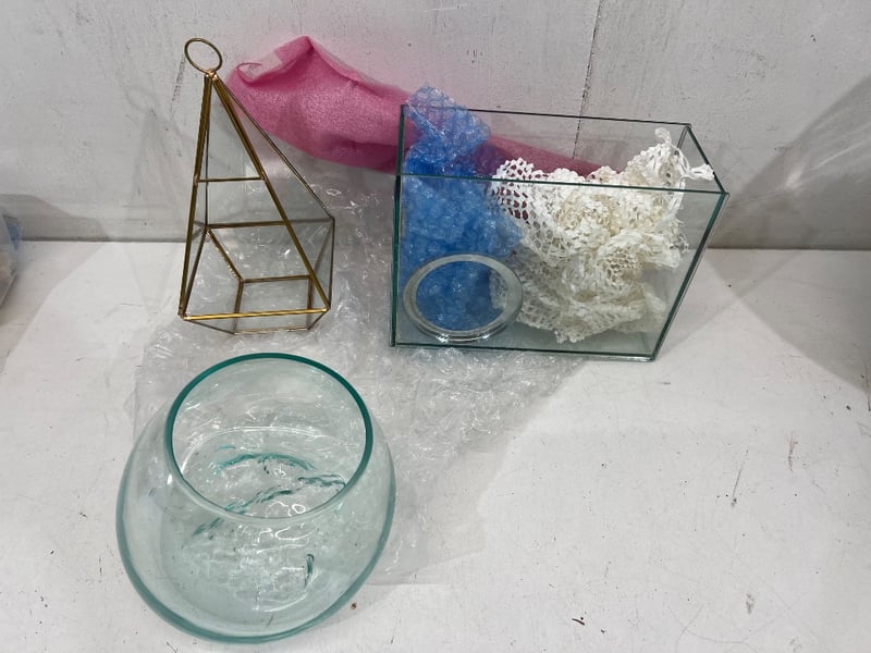 Assorted decor, includes Terrariums, seashells, assorted colours/ stylesSold as lot