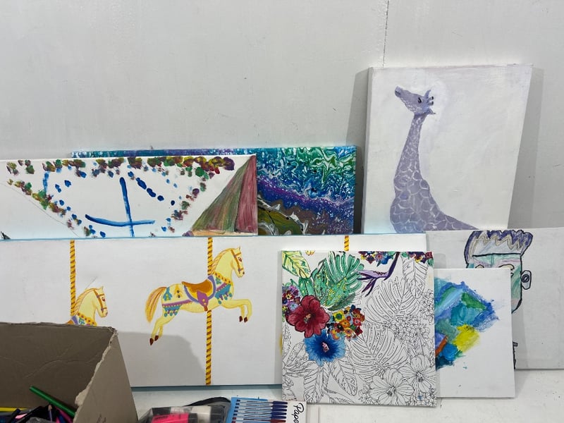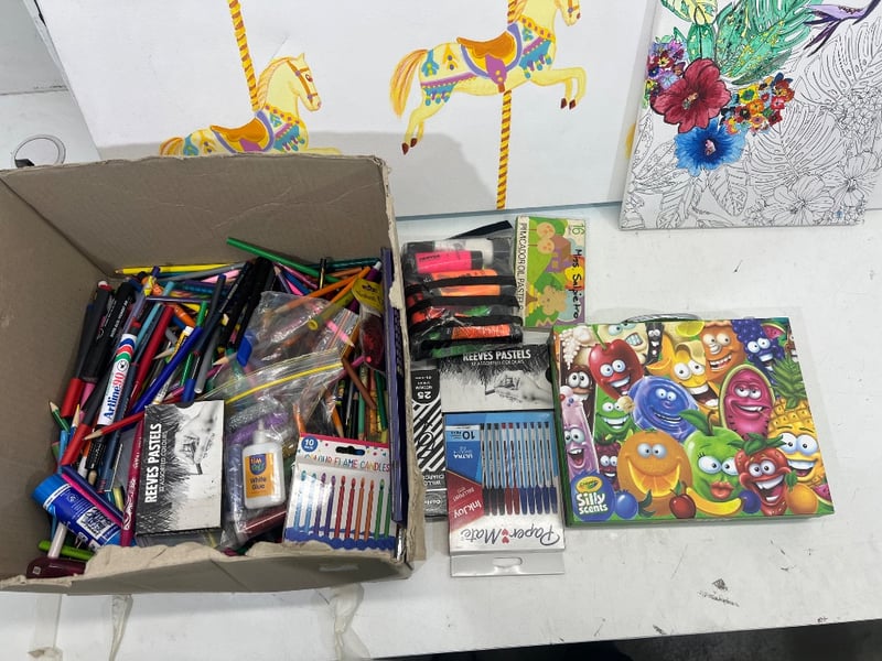 Assorted art supplies; includes; pencils, paint, pens, pastels etc