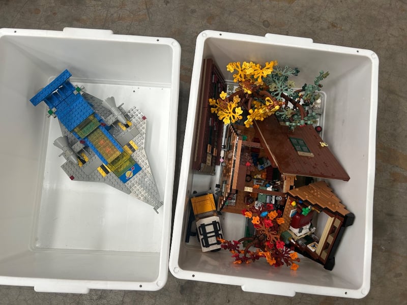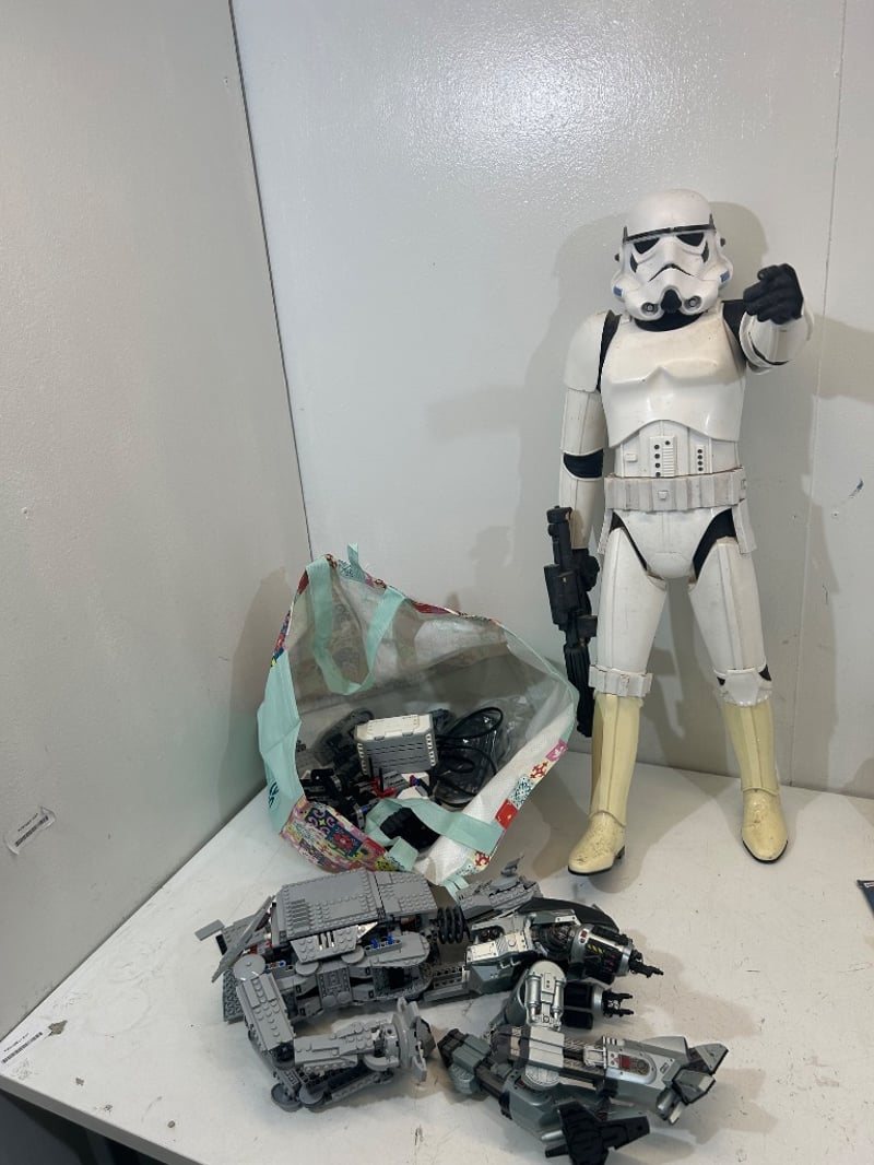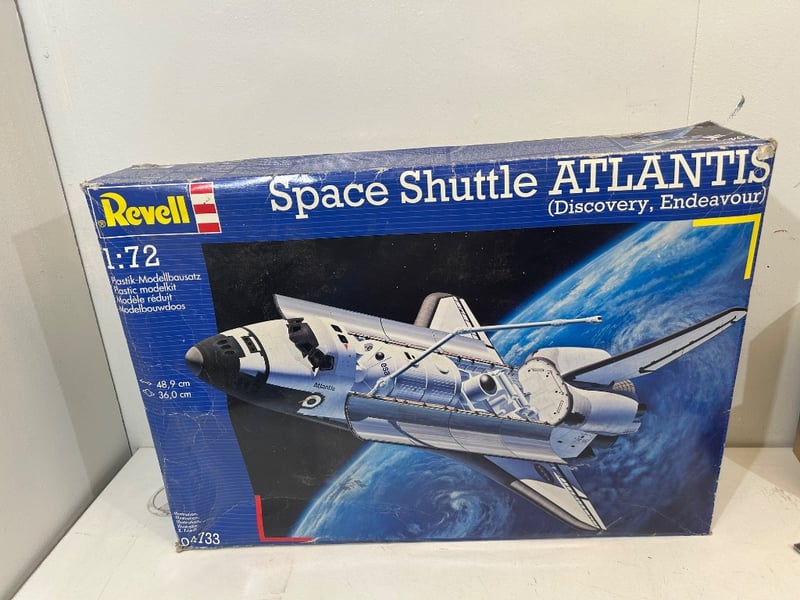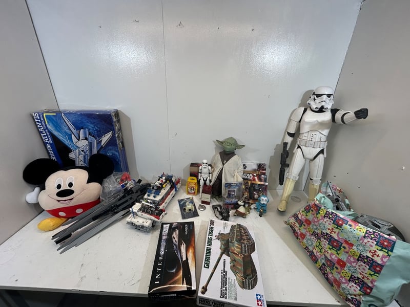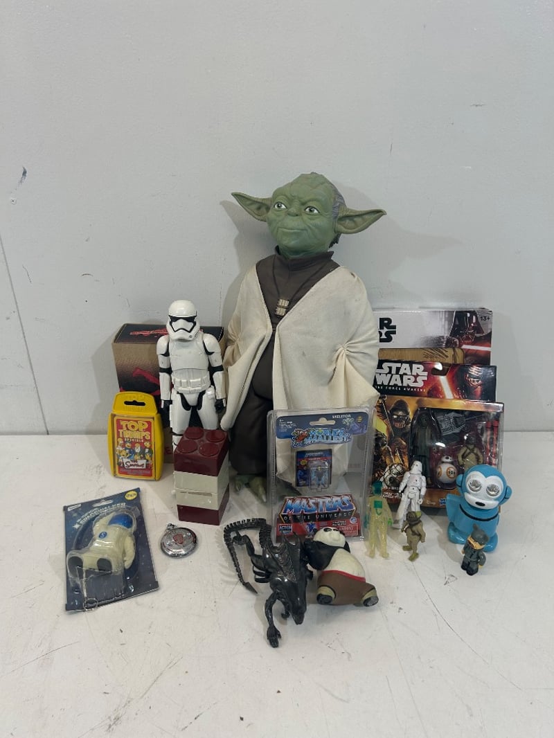 Assorted toys includes, LEGO models and loose LEGO builds (spacecraft and building scenes), Revell Space Shuttle Atlantis model kit, Star Wars figures and collectibles (including Stormtroopers and Yoda), Disney character plush and figures, assorted action figures, toy vehicles, small figurines, and boxed collectible toys. Assorted brands include LEGO, Revell, Star Wars, Disney, Top Trumps, Masters of the Universe, and Hasbro. Sold as lot