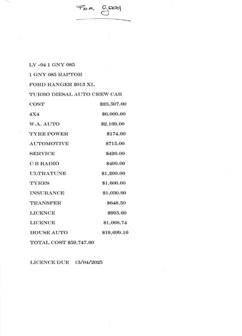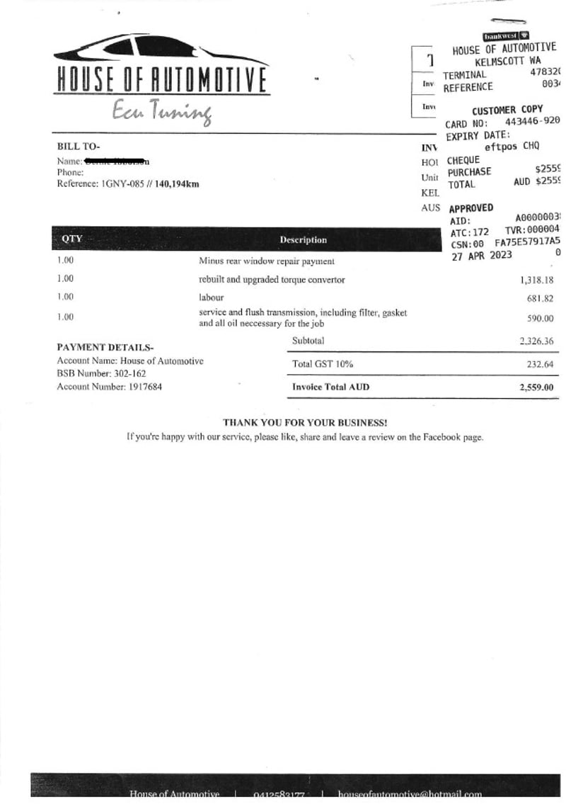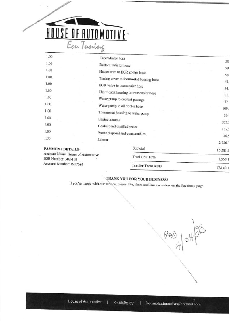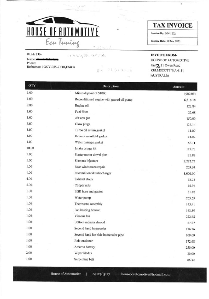 Mechanical works completed in 2023, supported by attached tax invoices (in photos). Invoices include a fully reconditioned engine with a geared oil pump, upgraded and rebuilt torque converter, replacement of multiple hoses, gaskets and mounts, new injectors, new water pump, thermostat assembly, viscous fan, bottom radiator shroud, second-hand intercoolers, belt tensioner, battery, wiper blades, and serpentine belt.