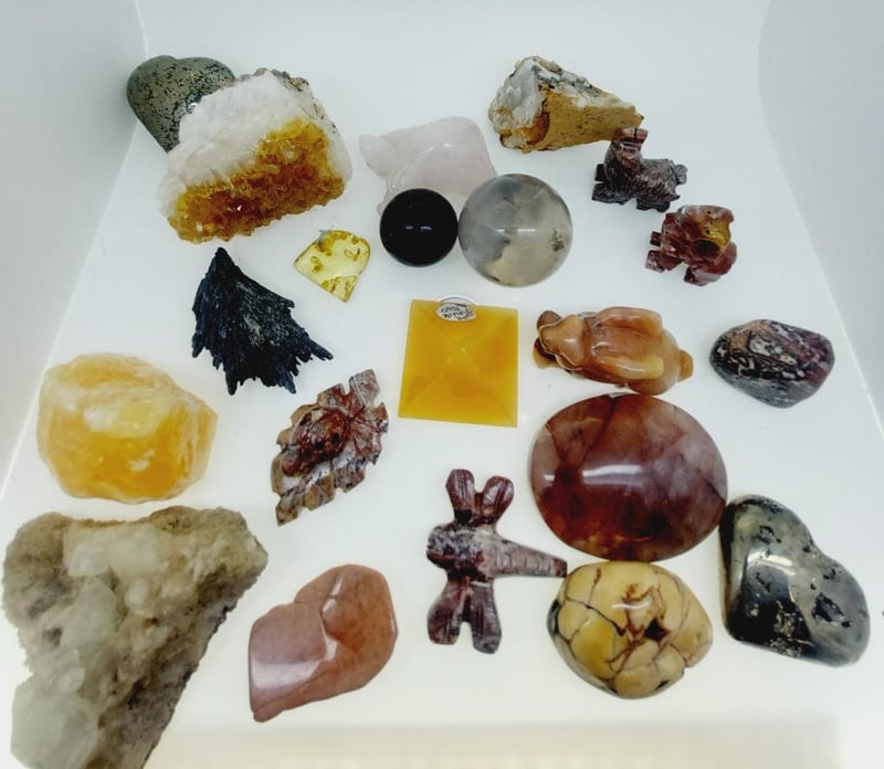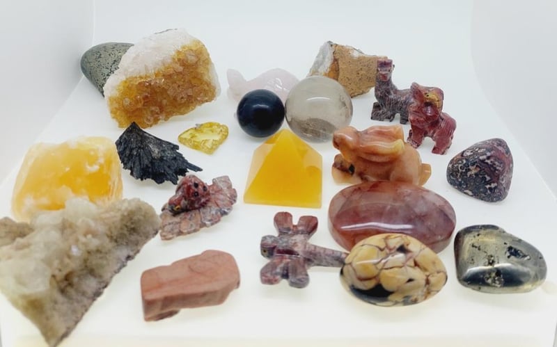 ASSORTED CRYSTALS INCLUDING ORANGE CALCITE, STRAWBERRY QUARTZ AND MORE...