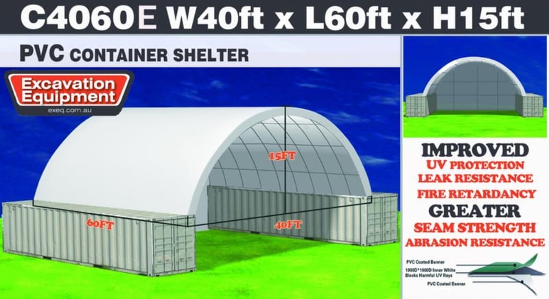 Unused Heavy Duty 40ft x 60ft Container Shelter with End Wall, 40ft wide x 60ft long x 15ft high, Model: C4060E, Heavy Duty PVC Fabric, Galvanised tube frame, 2 boxes per container shelter, Approximate Shipping Dimensions(per box): 2400mm L x 740mm W x 780mm H, Approximate Combined Weight of both boxes: 1618kg
