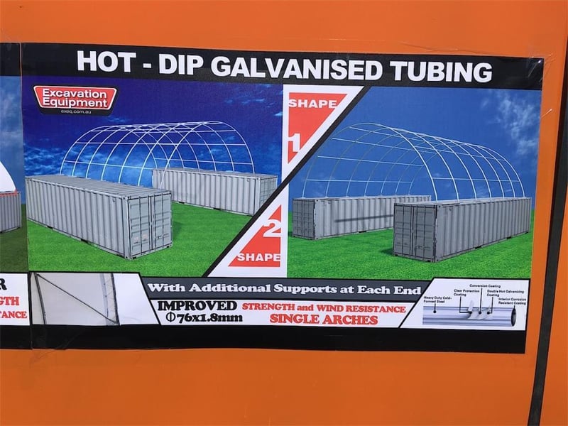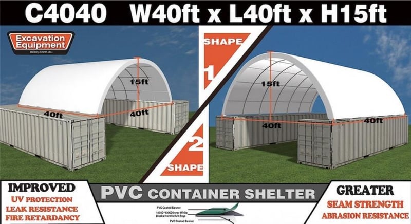 Unused Heavy duty 40ft Container Shelter, Model: C4040, 40ft wide x 40ft long x 15ft High, Heavy duty PVC fabric, galvanised tube frame, Approximate Shipping Dimensions: 2440mm L x 740mm W x 1150mm H, Approximate Weight: 900kg