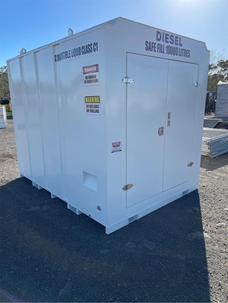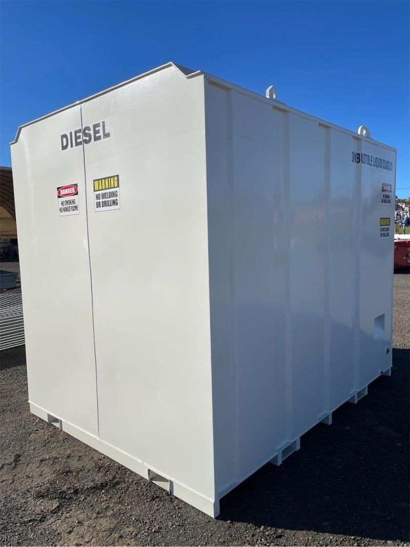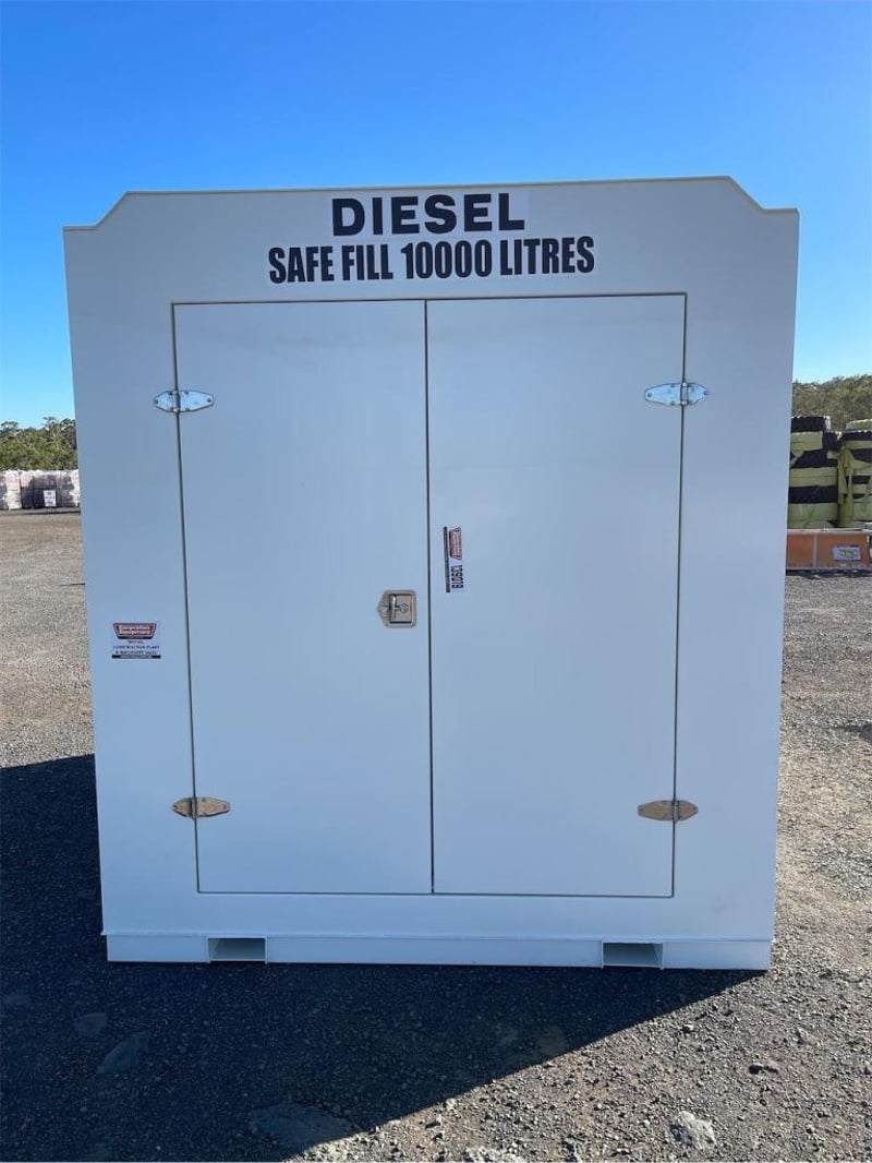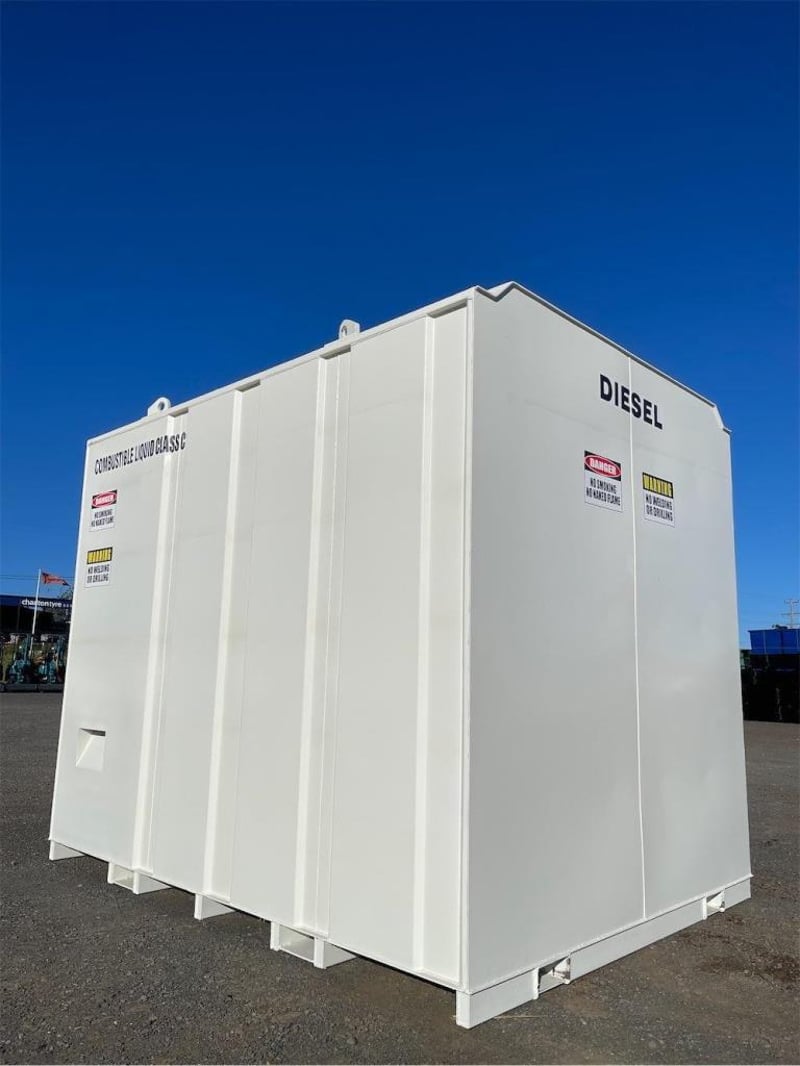 Unused 11000 Litre Self Bunded Fuel Storage Tank, Model: PS11, Safe Fill: 10000 Litres, Comes with Electric Pump, Galvanized Grated Bunded front Compartment with drain, DN50 (2”) Flanged 150# Fill Point with Full Bore Ball Valve, Non Return Valve, Male Camlock Fitting, Dust Cap, Mechanical Overfill Protection Valve, 12V Overfill Alarm, DN50 (2”) Flanged 150# Suction Point with Anti Syphon, Foot Valve Assembly, Fork Pockets, TARE: 3100kg, Approximate Shipping Dimensions: 2950mm L x 2240mm W x 2520mm H, NOTE: This tank is constructed to AS1692-2006 & AS1940-2017, To be installed & maintained in accordance with AS1940, Tank is suitable for combustible Liquid, Serial No: INCU110072