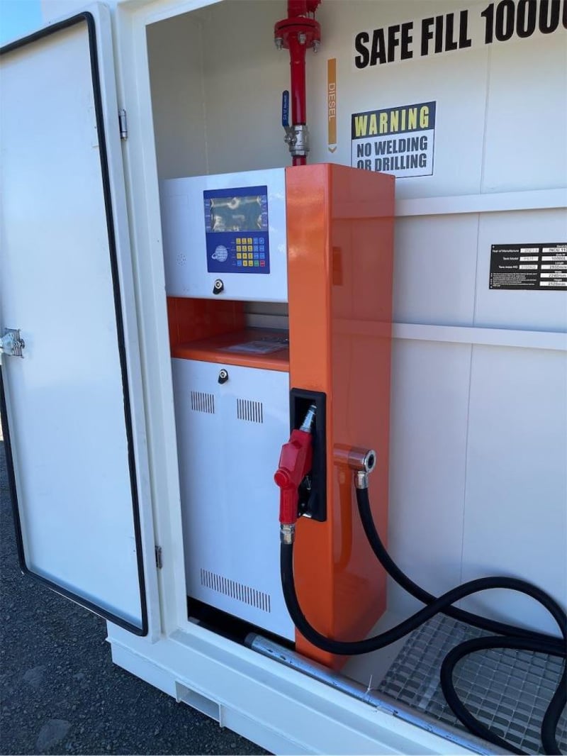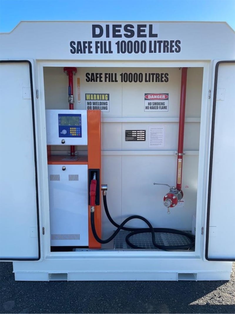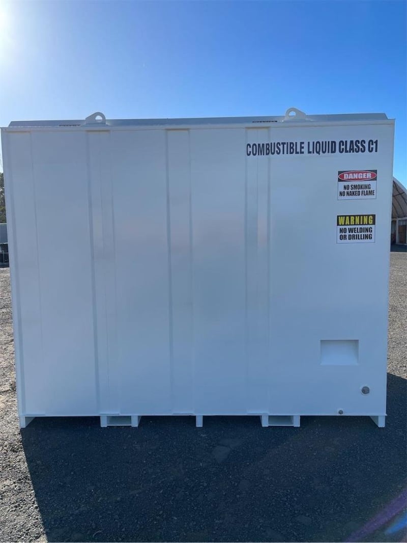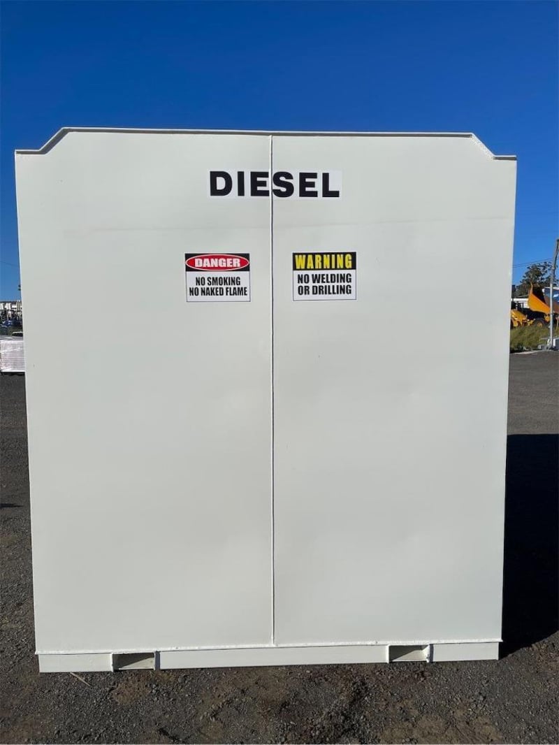 Unused 11000 Litre Self Bunded Fuel Storage Tank, Model: PS11, Safe Fill: 10000 Litres, Comes with Electric Pump, Galvanized Grated Bunded front Compartment with drain, DN50 (2”) Flanged 150# Fill Point with Full Bore Ball Valve, Non Return Valve, Male Camlock Fitting, Dust Cap, Mechanical Overfill Protection Valve, 12V Overfill Alarm, DN50 (2”) Flanged 150# Suction Point with Anti Syphon, Foot Valve Assembly, Fork Pockets, TARE: 3100kg, Approximate Shipping Dimensions: 2950mm L x 2240mm W x 2520mm H, NOTE: This tank is constructed to AS1692-2006 & AS1940-2017, To be installed & maintained in accordance with AS1940, Tank is suitable for combustible Liquid, Serial No: INCU110072