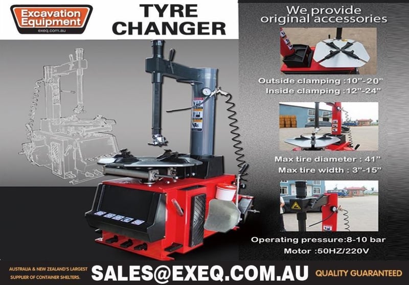 Unused Tyre Changer, outside clamping : 10"-20", inside clamping: 12"-24", Make Tyre diameter: 41", 8-10 bar, 220V, Approximate Shipping Dimensions: 1150mm L x 900mm W x 950mm H, Approximate Shipping Weight: 215kg