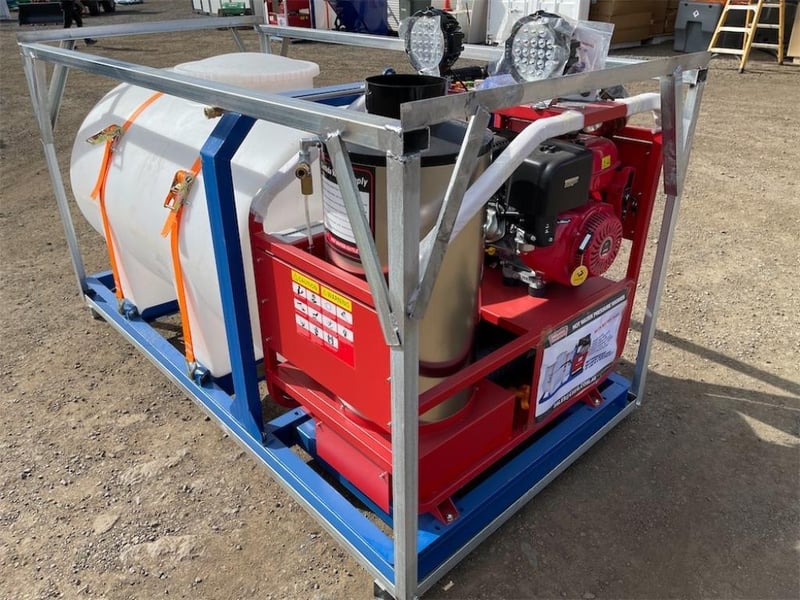 Unused Heated Pressure Washer / Water Blaster with Tank, 3600PSI, Key Start, Diesel Fired Burner, Various Spray Nozzles, Lance / Gurney, Skid Mounted with Fork Pockets, Heavy Duty Steel Frame, Work Lights, Approximate Shipping Dimensions: 2220mm L x 1240mm H x 1140mm W, Approximate Weight: 350kgLocation: Toowoomba, QLDRef: 169190