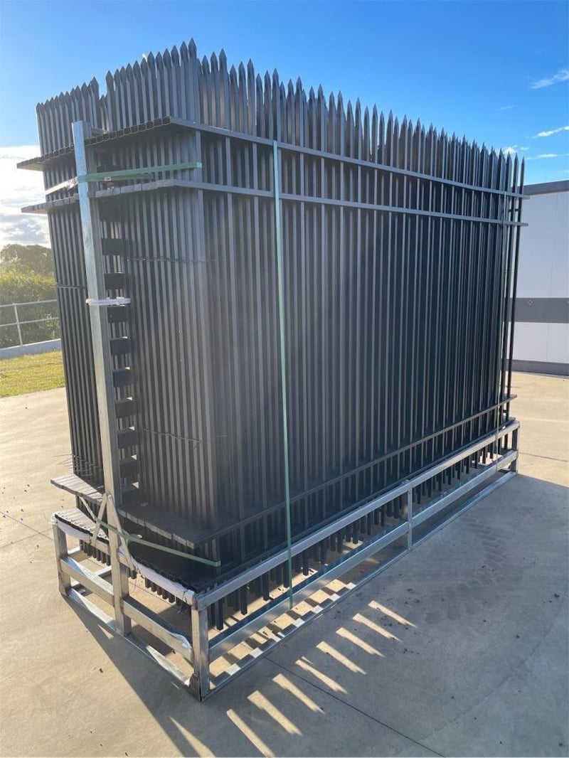 Qty of 24 Unused Wrought Iron Style Fence Panels, Comes with 24 Panels + 25 Posts, Each Panel is 10ft wide x 6ft 6in High, Rack Shipping Dimensions: 2.99m W x 1.1m L x 2.17m H, Weight: 950Kgs