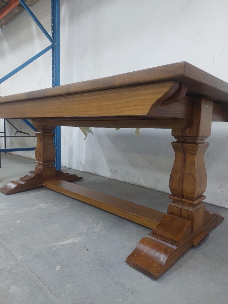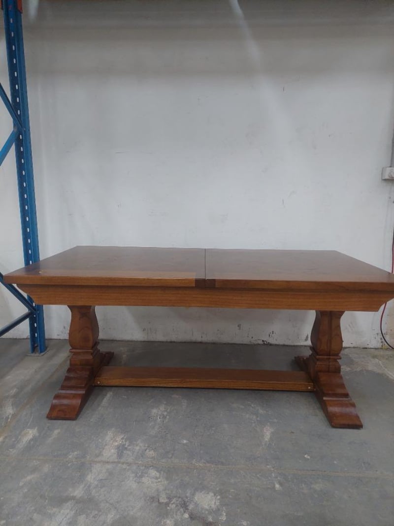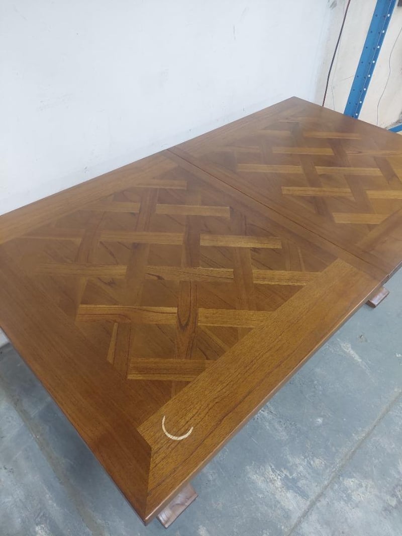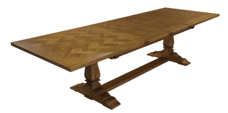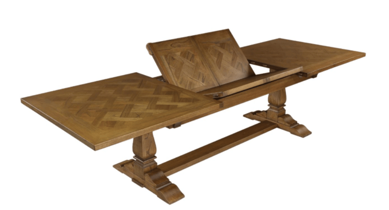 Extension Dining Table, ornately carved pedestal legs and a detailed parquetry top