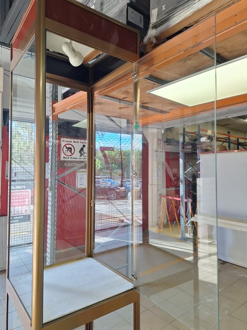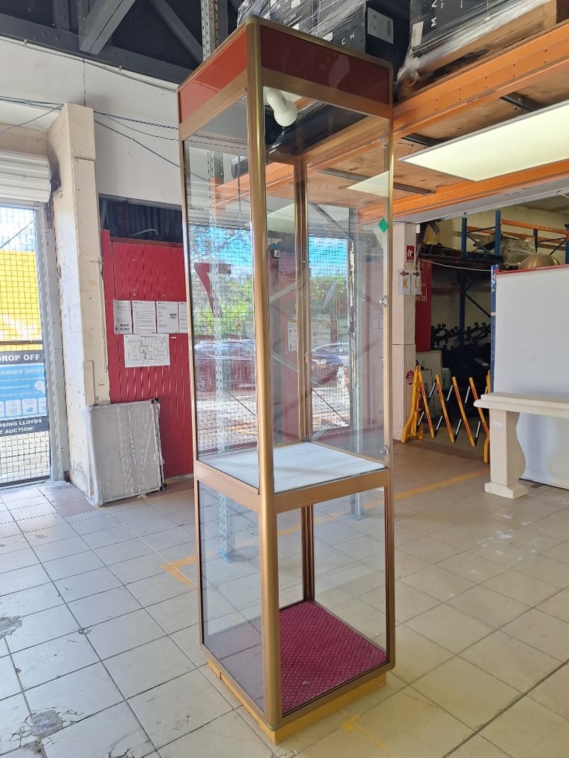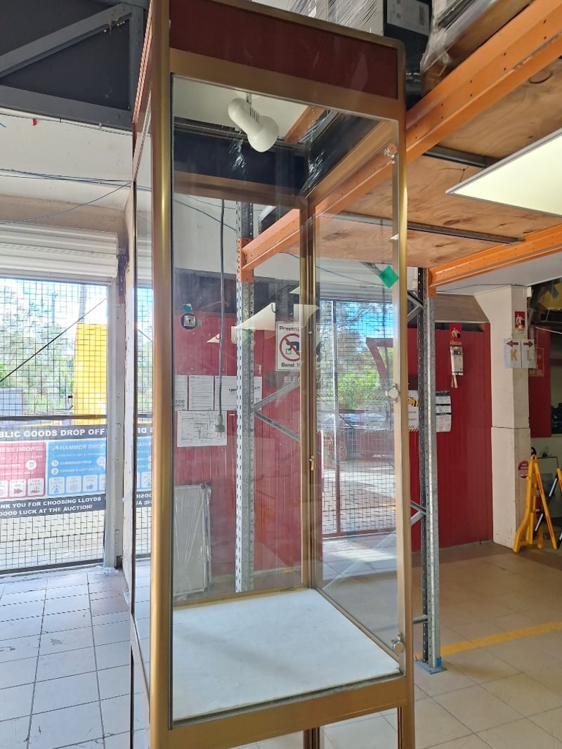 Freestanding Glass Display Cabinet, Metal Style, Gold Finish, No Key Included