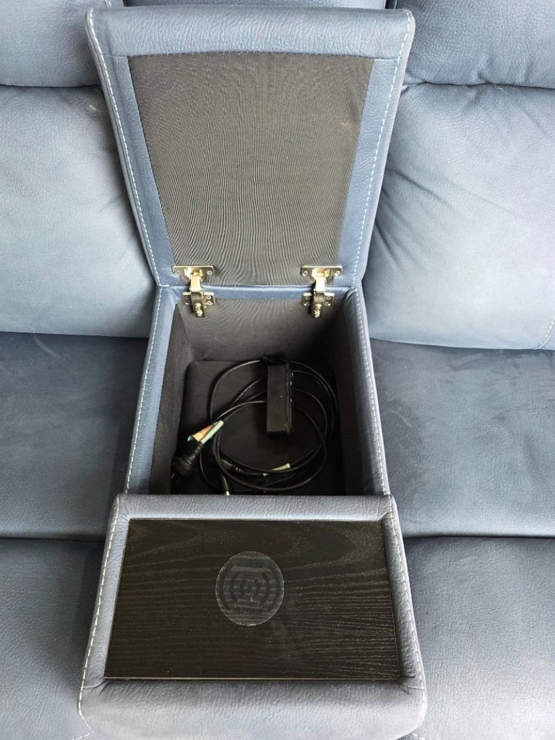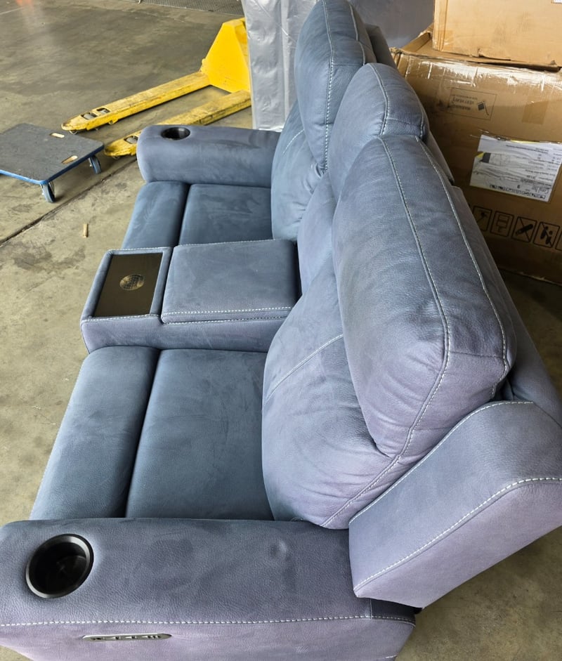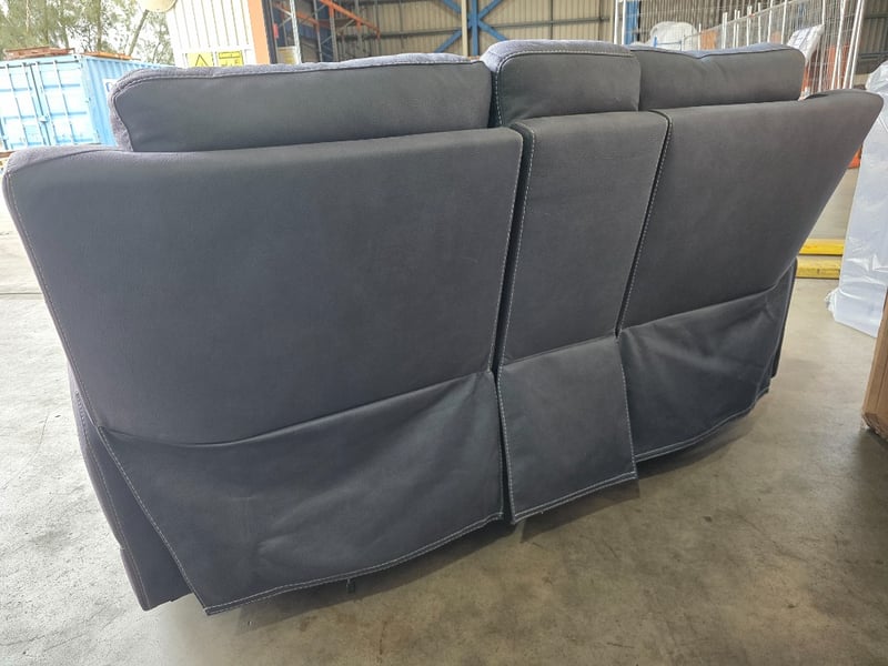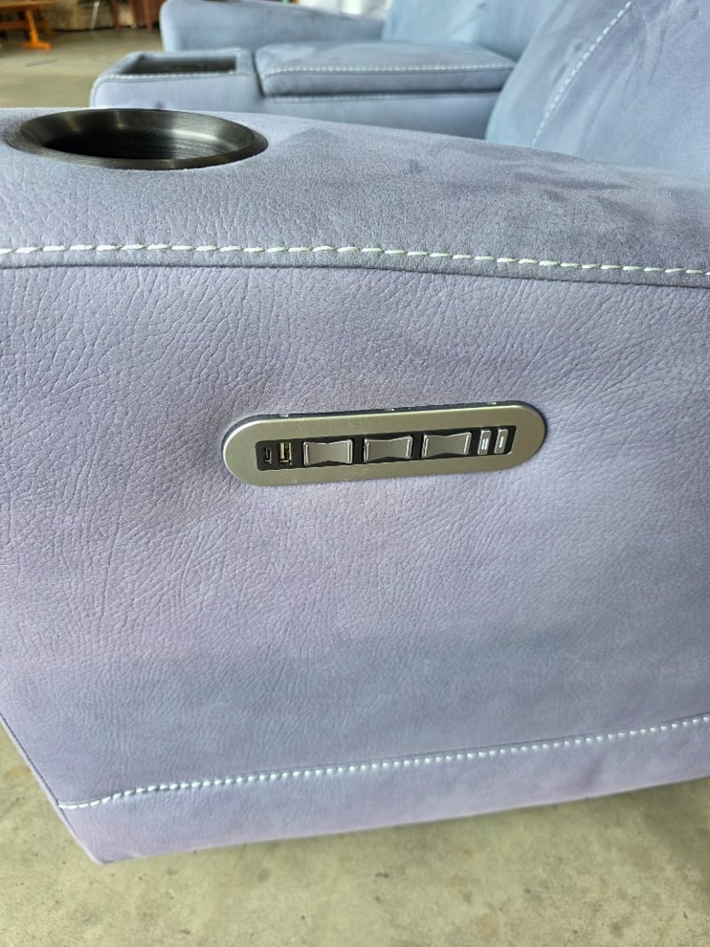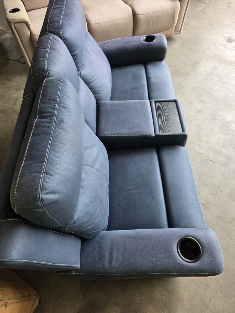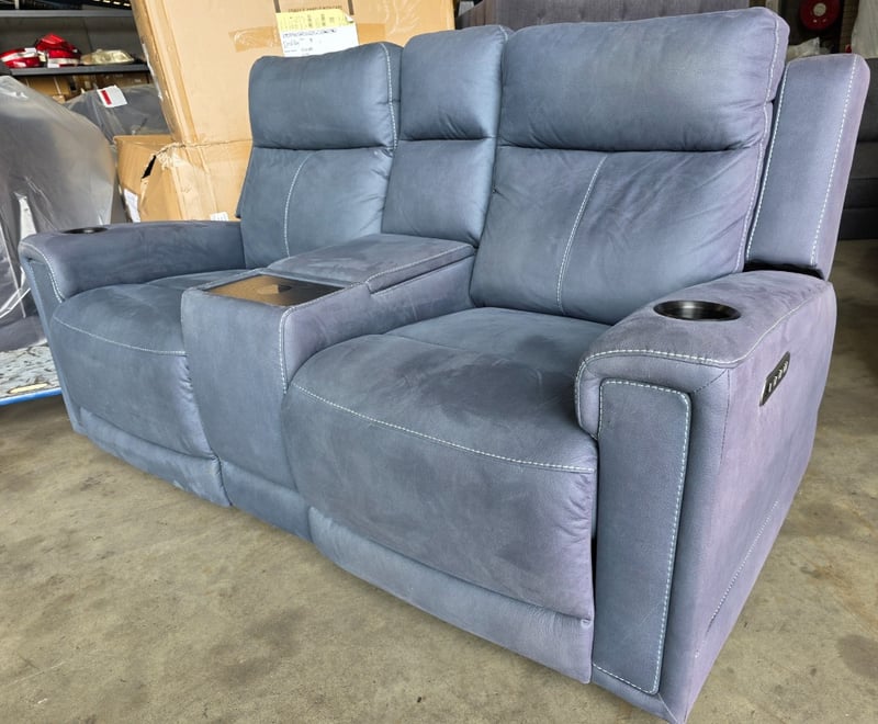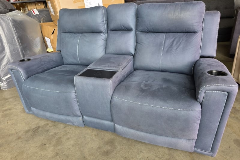 Wolgan 2-Seater aegean coloured Fabric Powered Recliner. Features wireless charging, cupholders and a middle compartment.