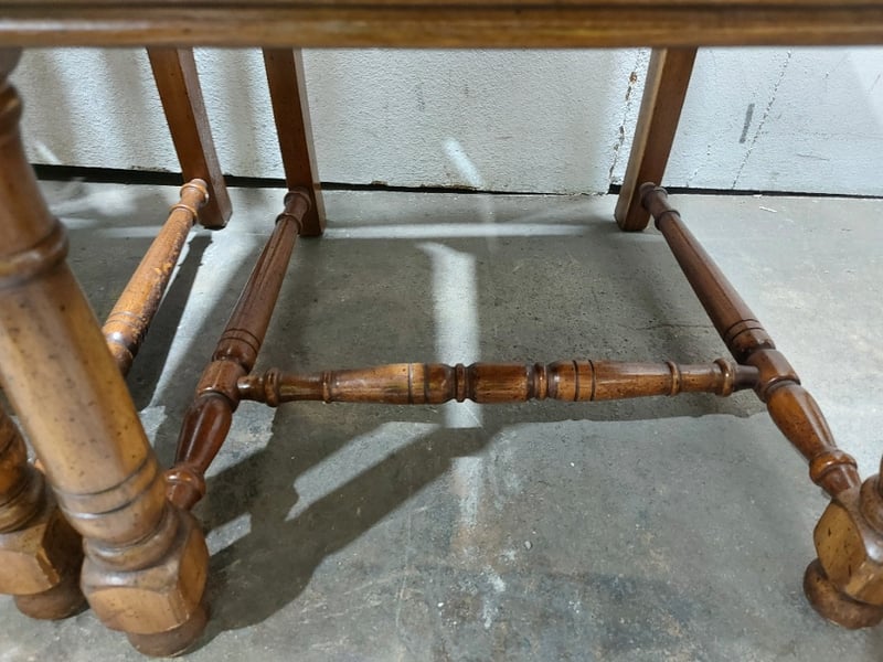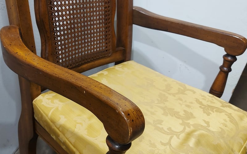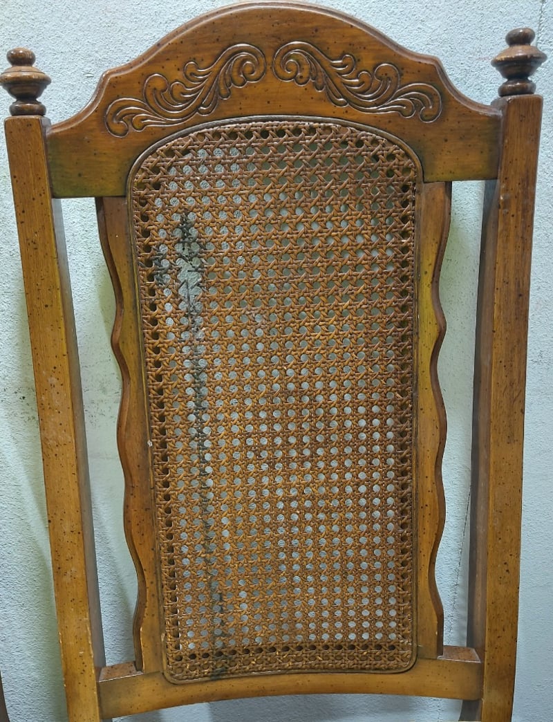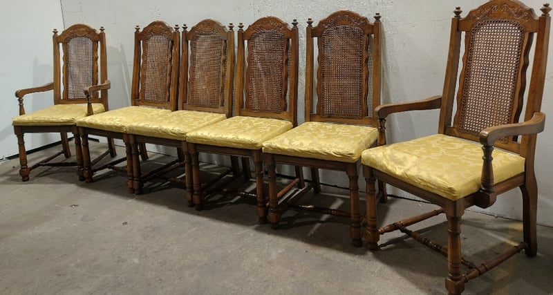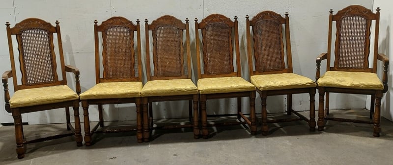 Dinning Chairs, wood like with cane backing and Upholstered seats. Includes ×2 chairs with arm rests.Dims: 108cm H, 54cm W, 48cm D.Sold as a lot.Notes:signs of wear.