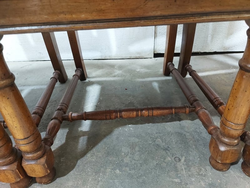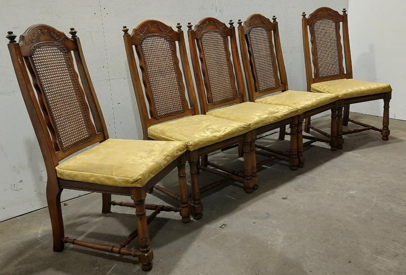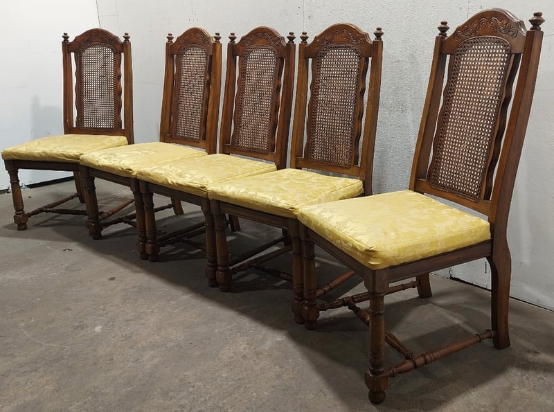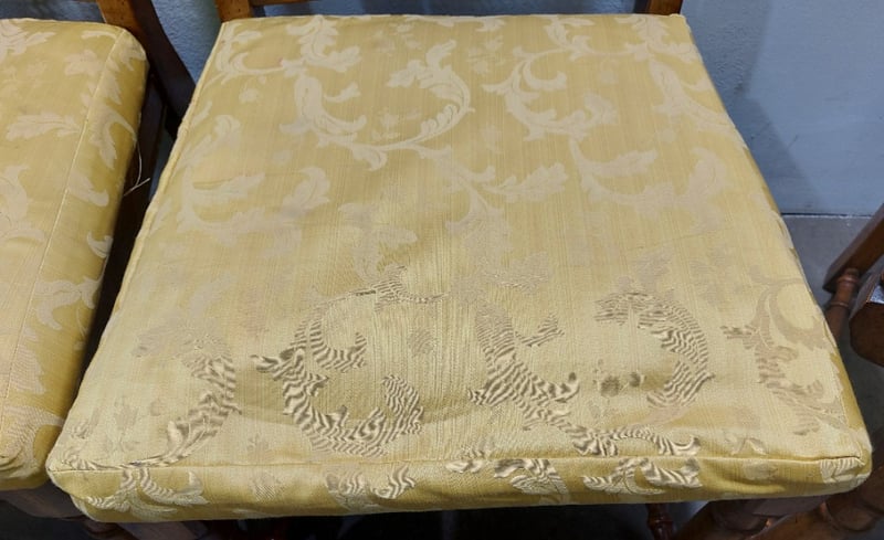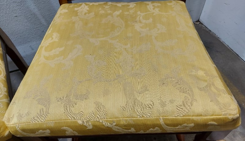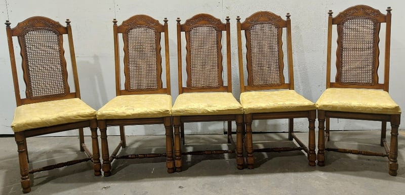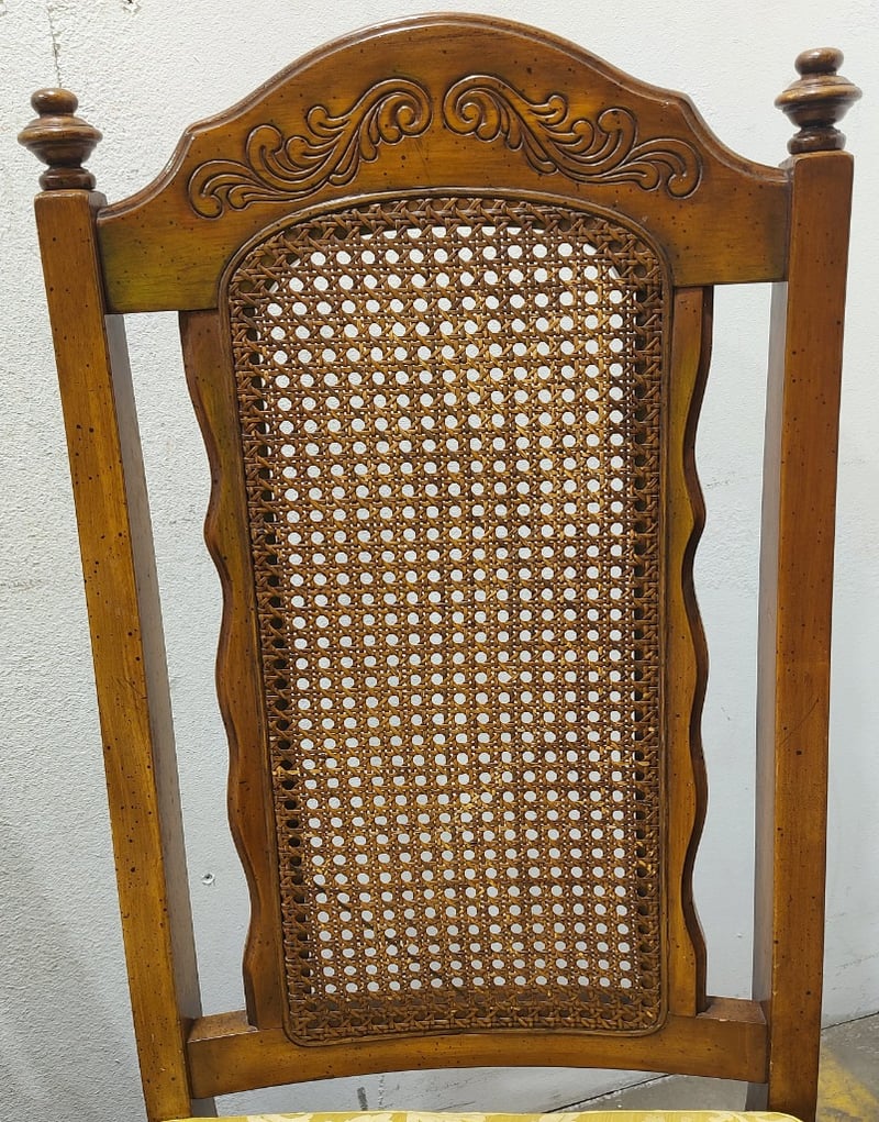 Dinning Chairs, wood like with cane backing and Upholstered seats. Dims: 108cm H, 54cm W, 48cm D.Sold as a lot.Notes:signs of wear.