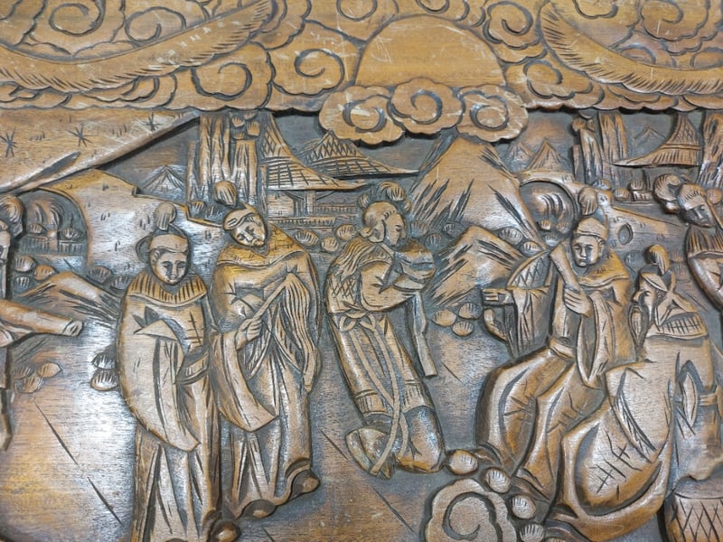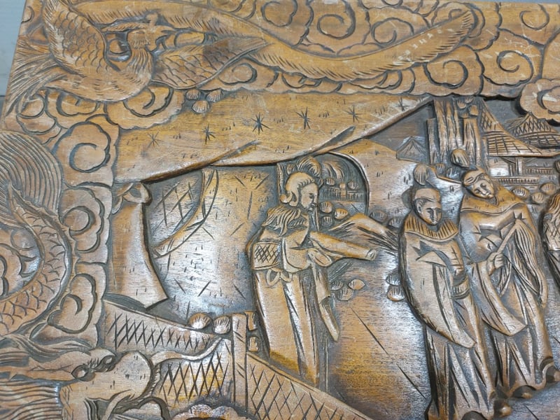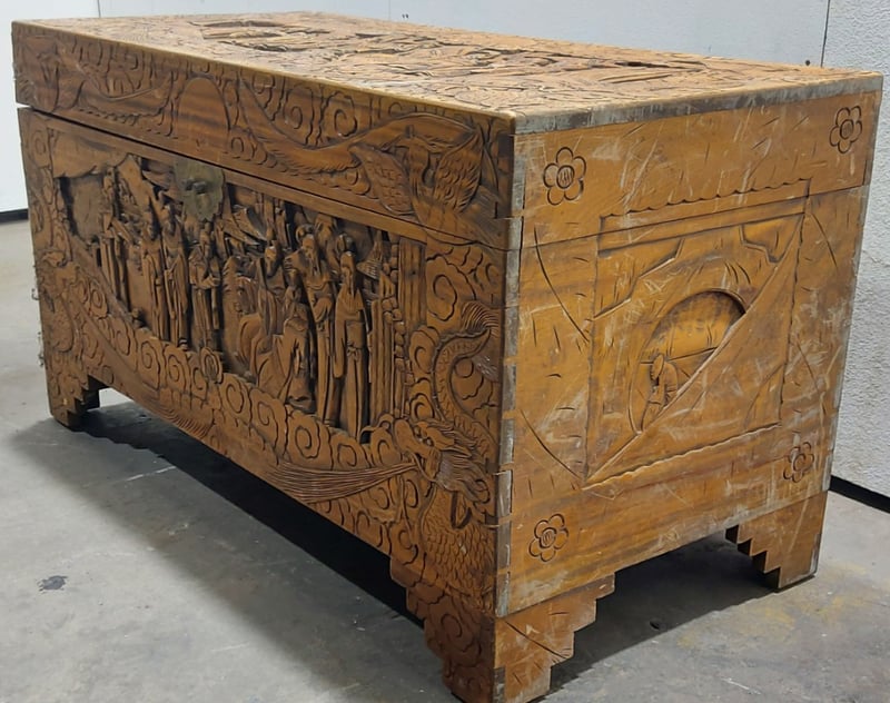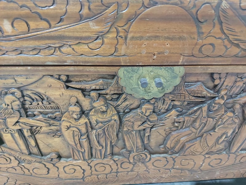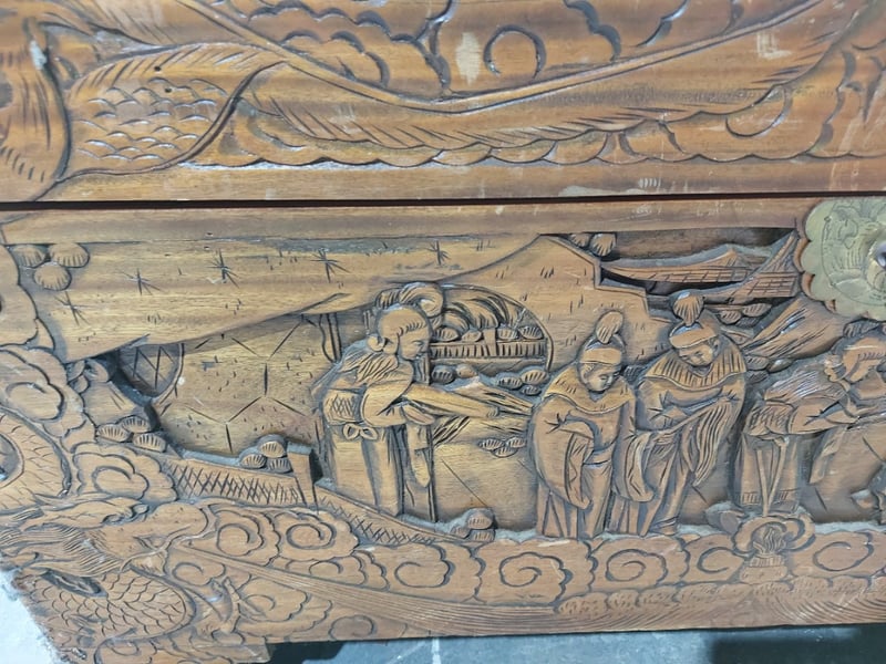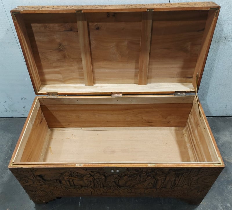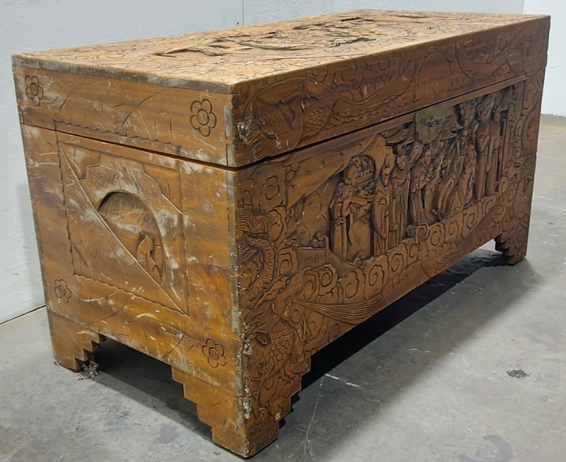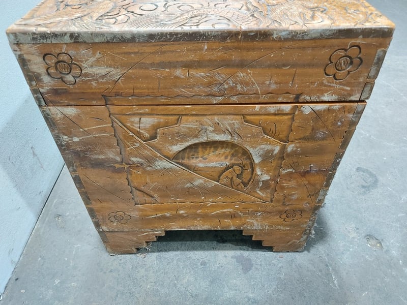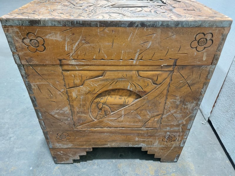 Chest,wood like and carved.Dims: 58cm H, 50cm W, 103cm D.Nnotes:signs of wear
