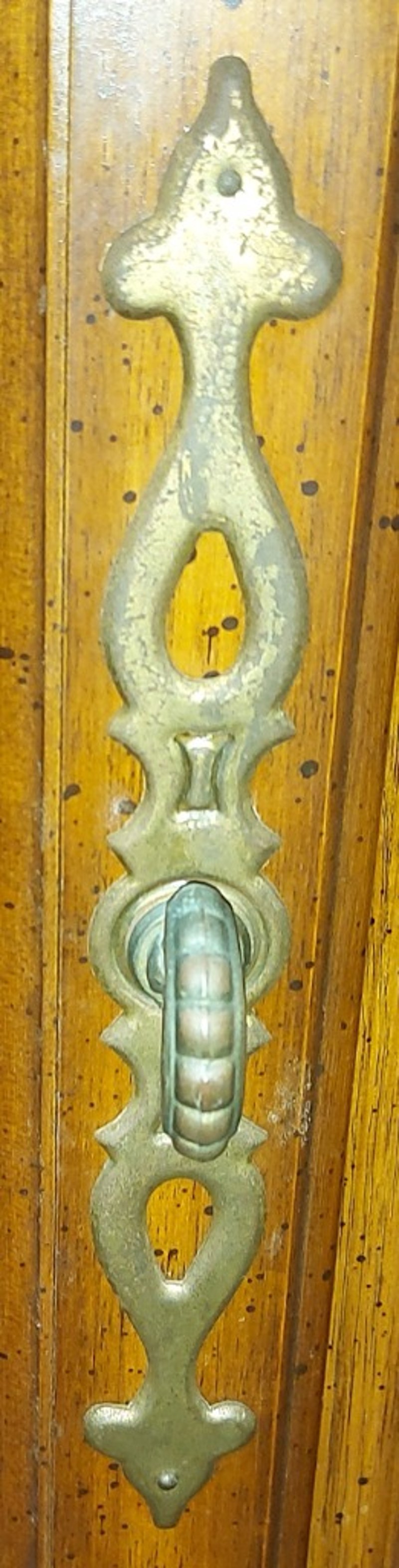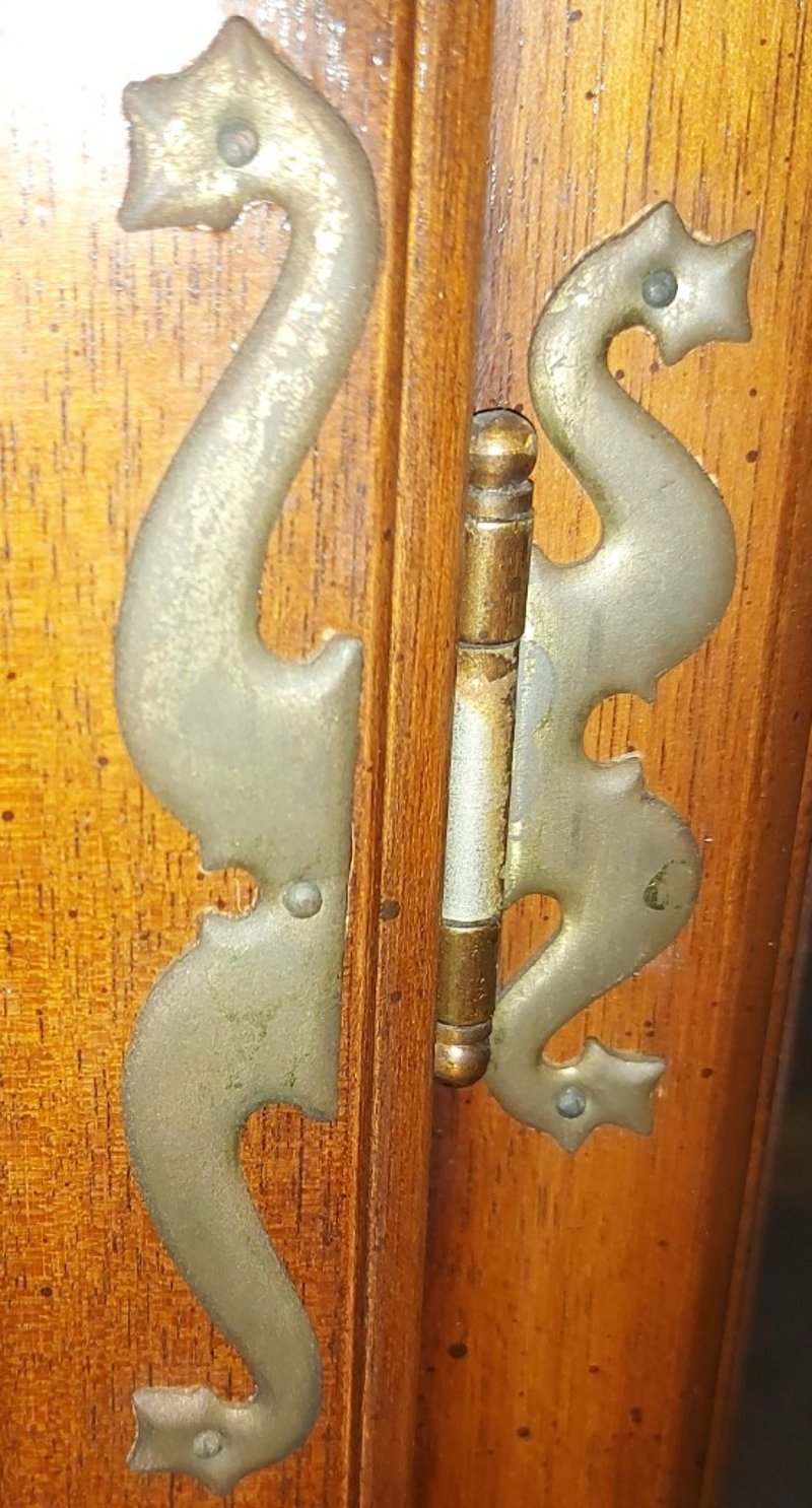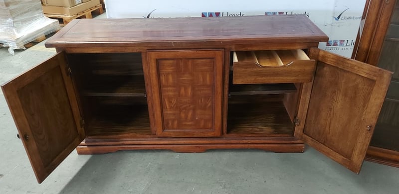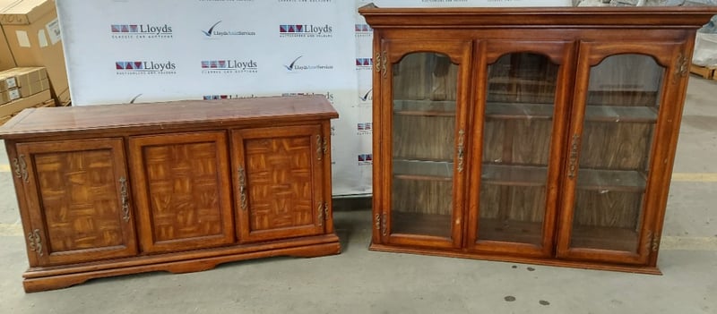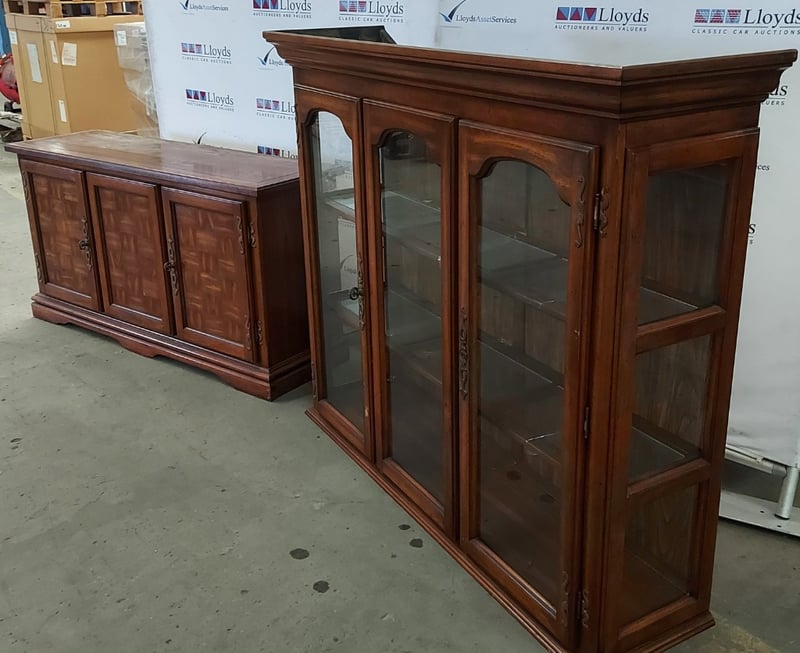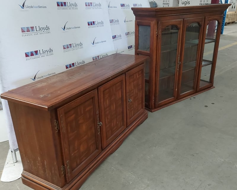 Buffet and Hutch, vintage like, wooden with glass panels, with decorative brass-like door hinges and door handles. Also has lighting.