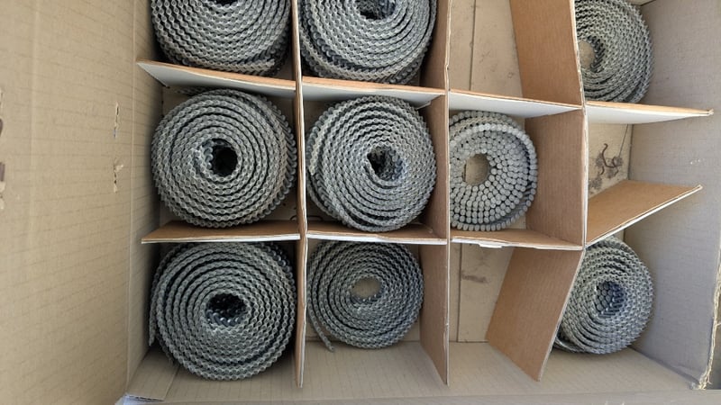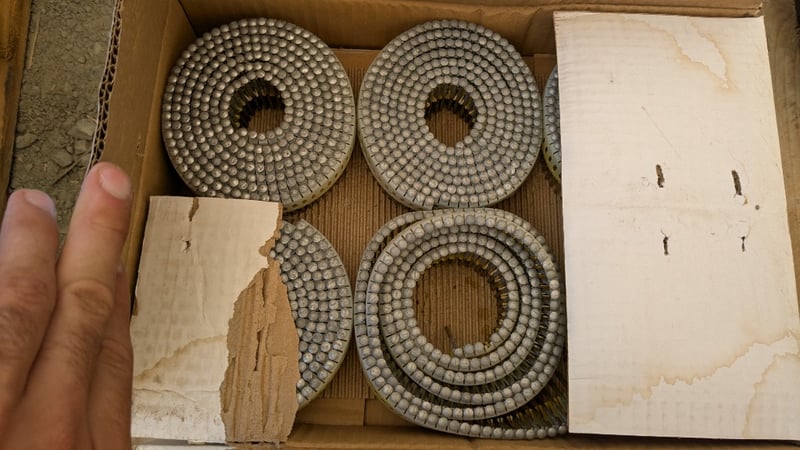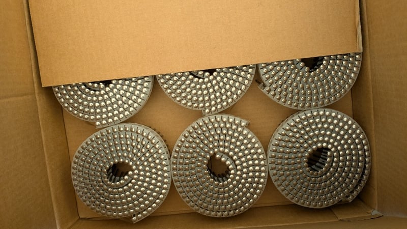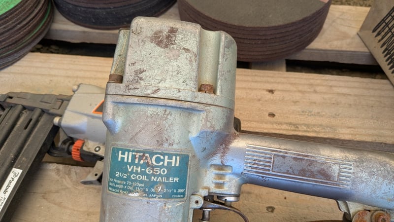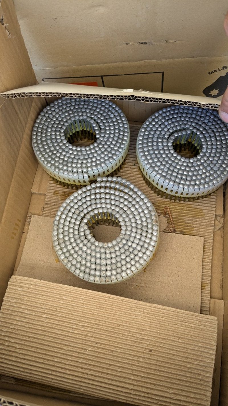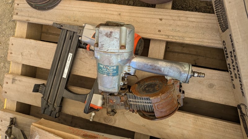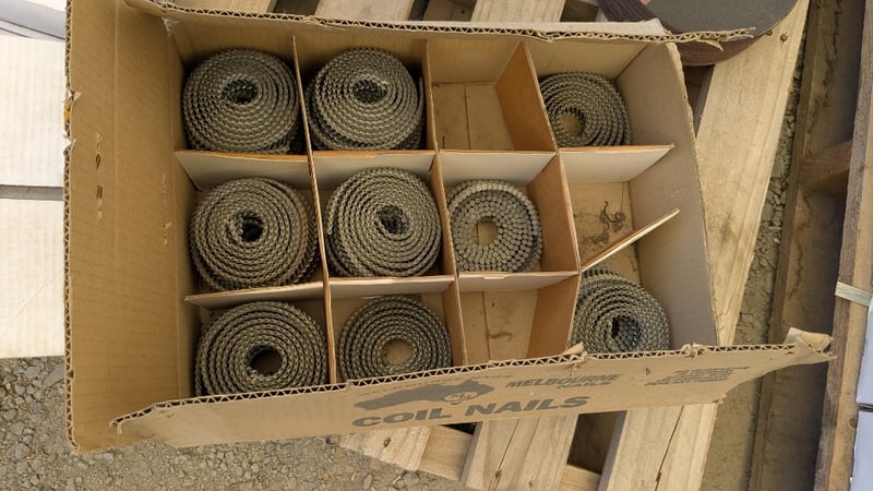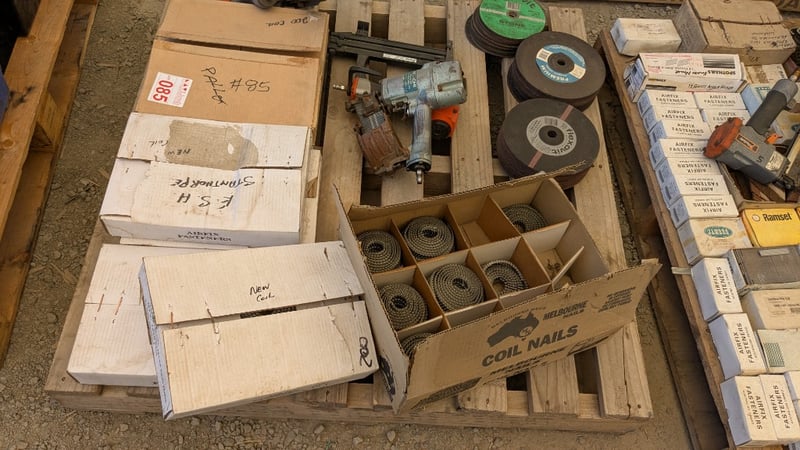Assorted Hardware Items, Includes Air Nail Guns, Assorted Nail Coils and Cutting Discs, Quantity to Pallet