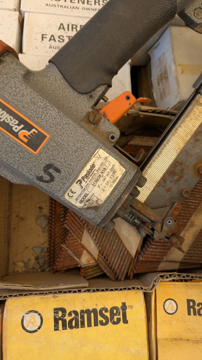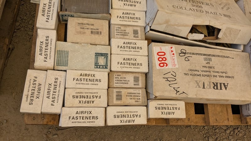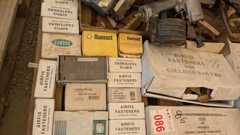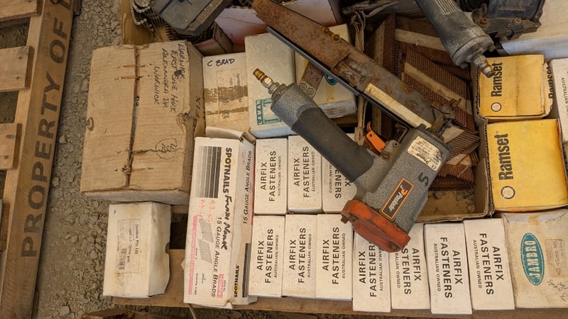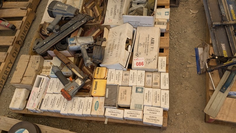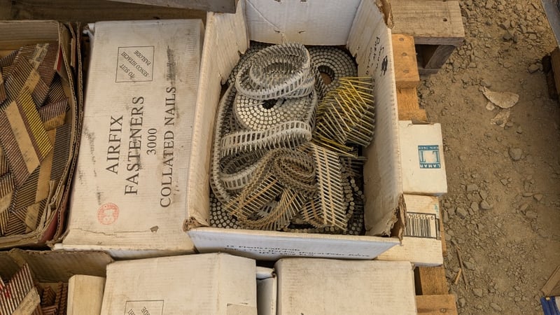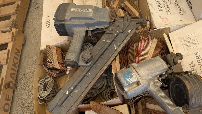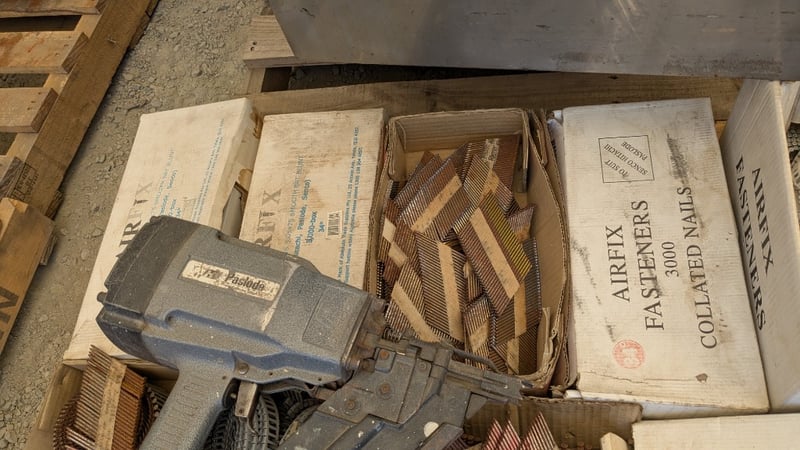 Assorted Hardware Items, Includes Air Nail Guns, Assorted Nail Coils, Quantity to Pallet