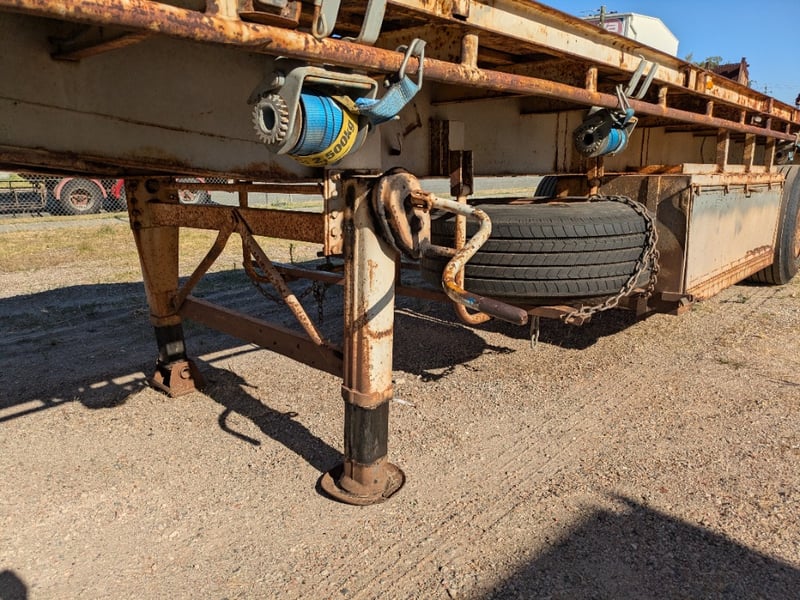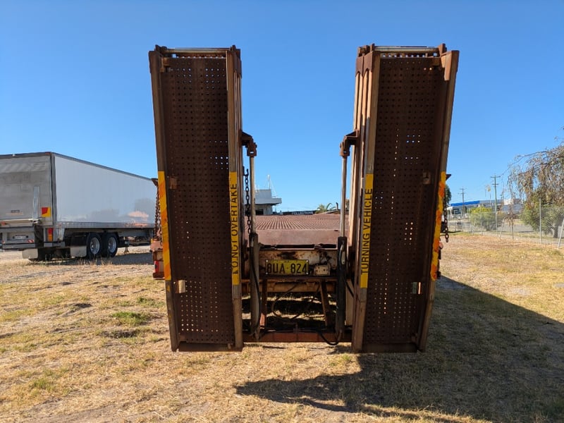 Deck / Body Type & Condition: Steel flat deck, surface rust present, loading ramps fitted to rear