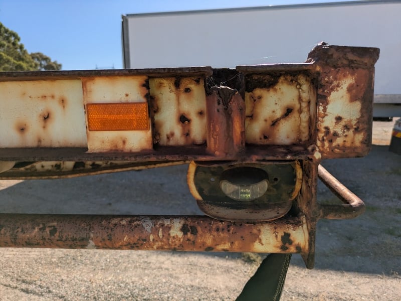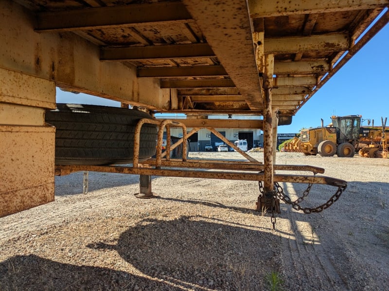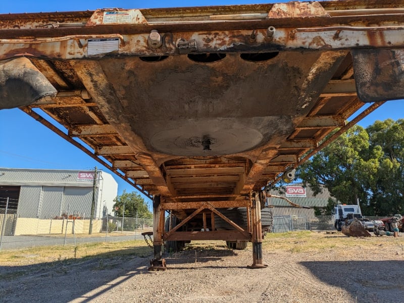 Trailer presents in fair to poor condition with extensive surface rust and corrosion visible across chassis, deck and components. Suspension, axles and braking hardware present. Lights, brakes and overall roadworthiness not tested. Suitable for refurbishment, farm use or project.