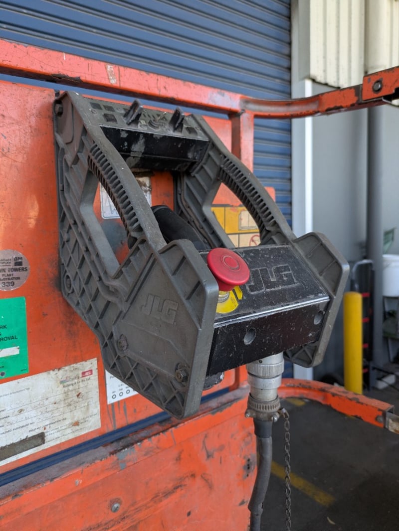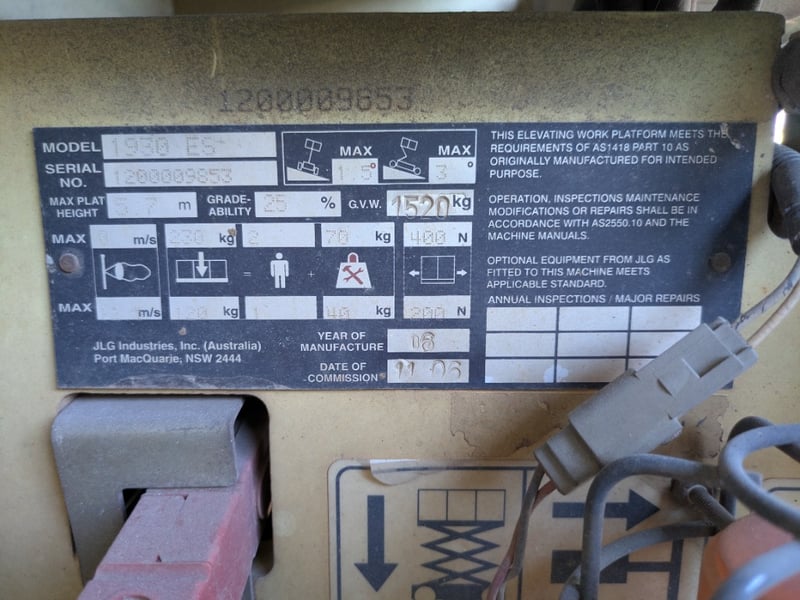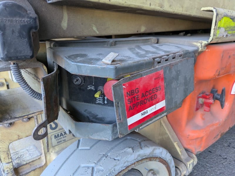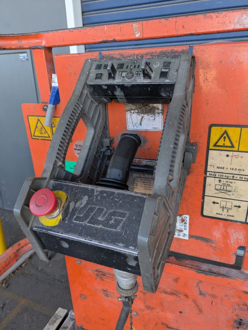 Safety Features (e.g. Guard Rails, Emergency Stop, Tilt Alarm): Guard rails fitted, emergency stop controls (platform and ground), tilt alarm (untested)