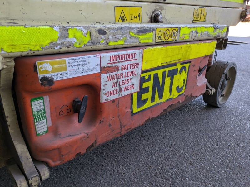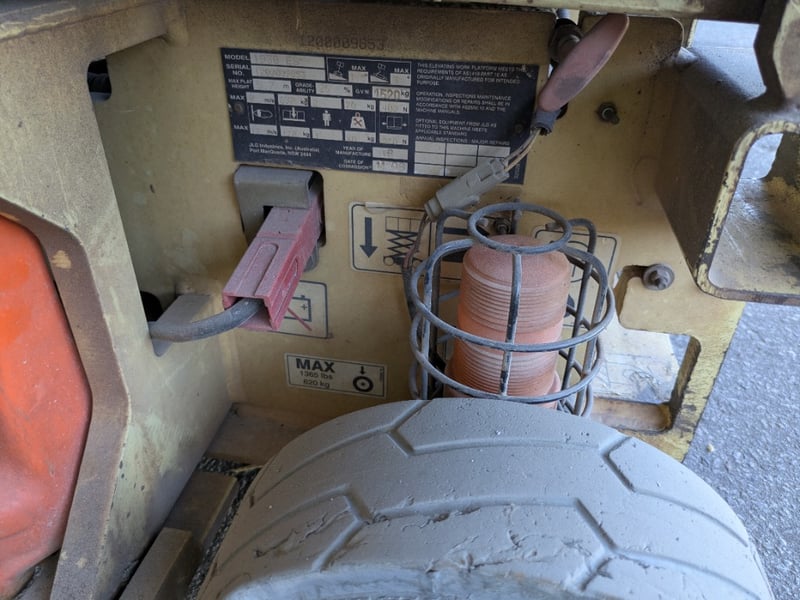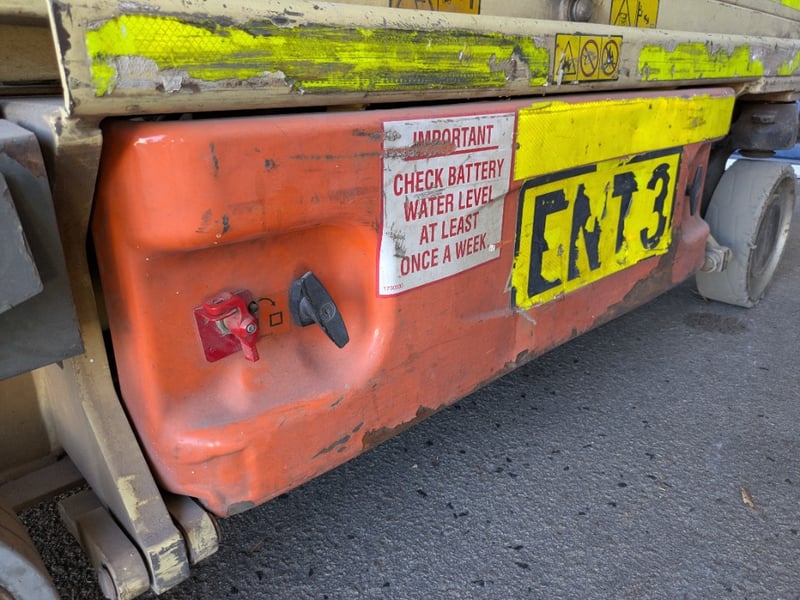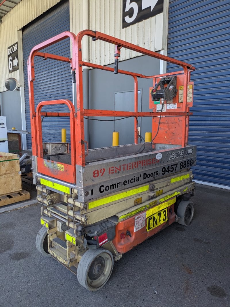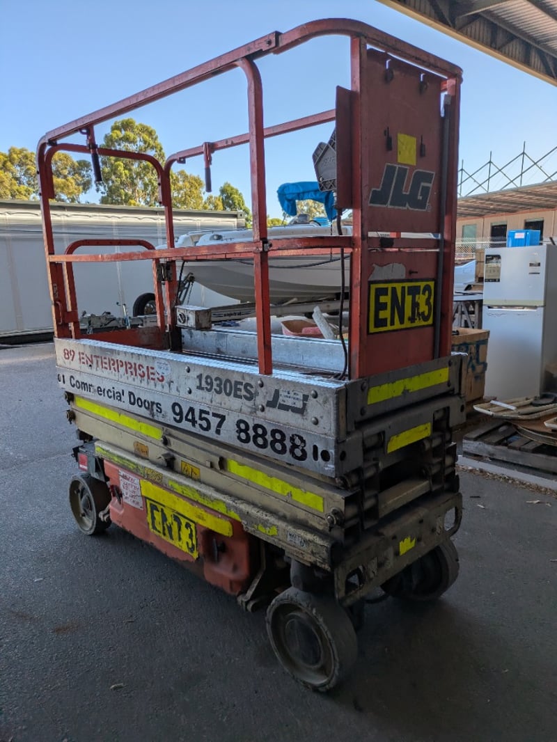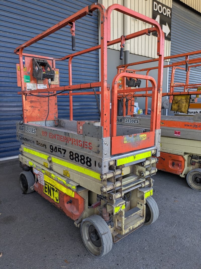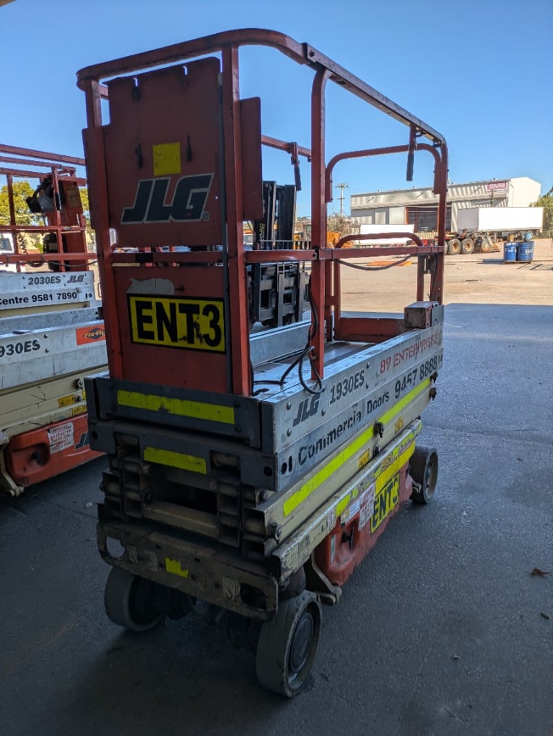 JLG 1930ES electric scissor lift presenting in used condition with cosmetic wear consistent with age and site use. Tyres show significant wear. Battery compartment, charger plug, controls visibly intact. Operational status and batteries not tested for working order.