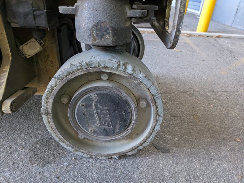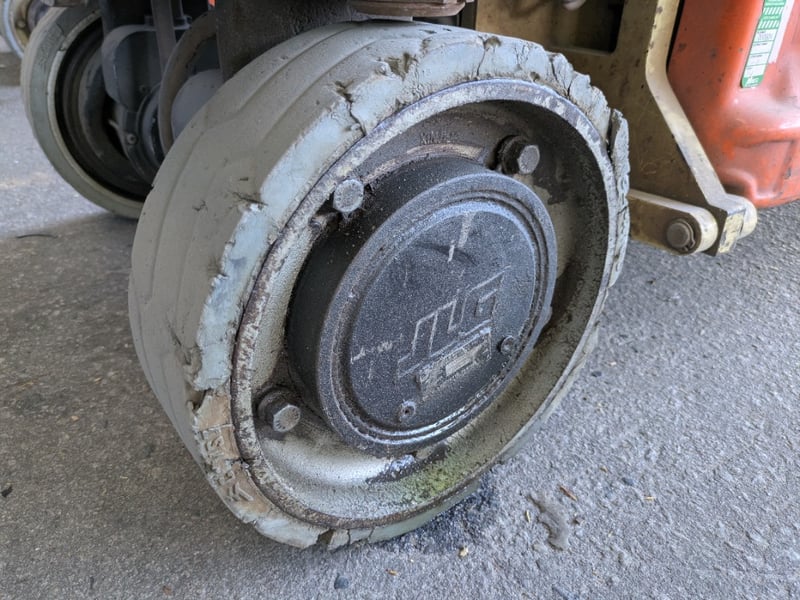 Tyres (Type & Condition): Solid non-marking tyres, heavily worn with chunking and flat spotting visible