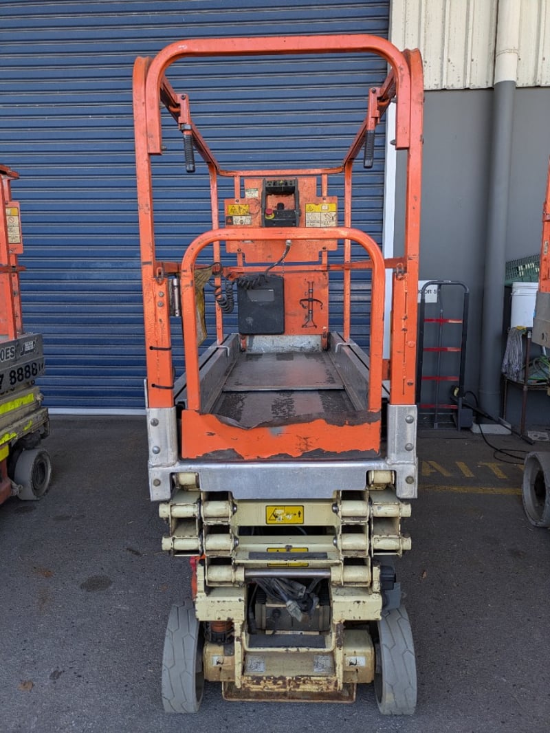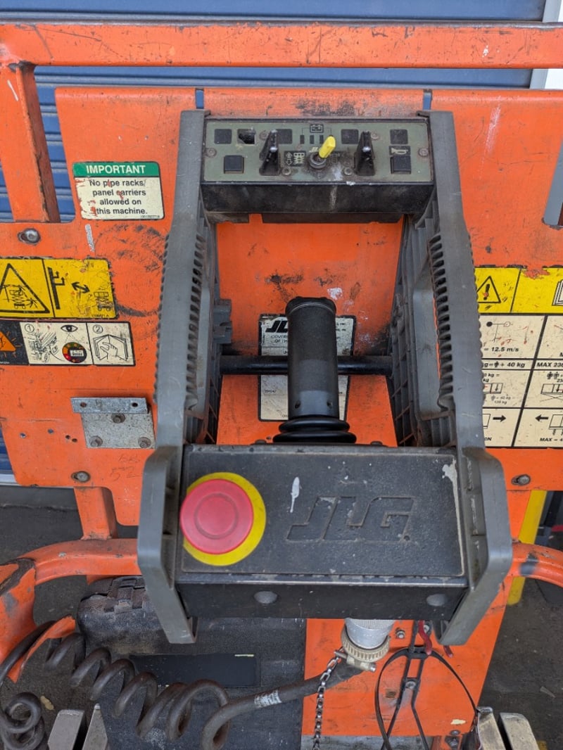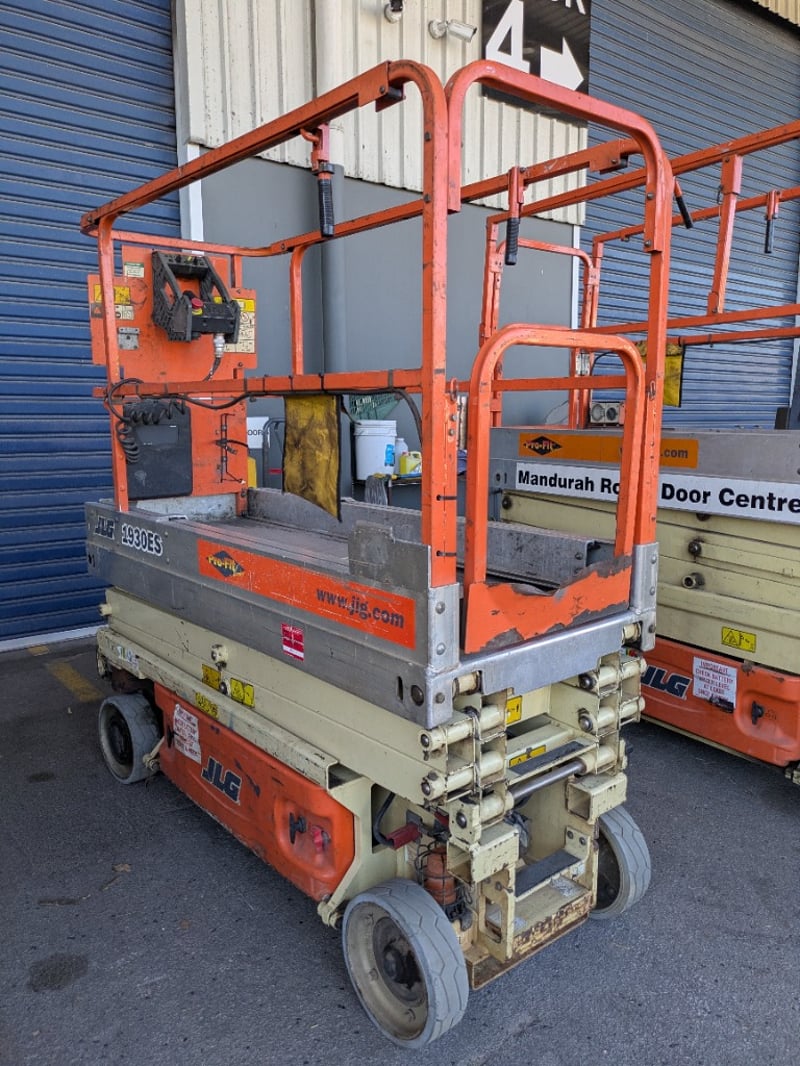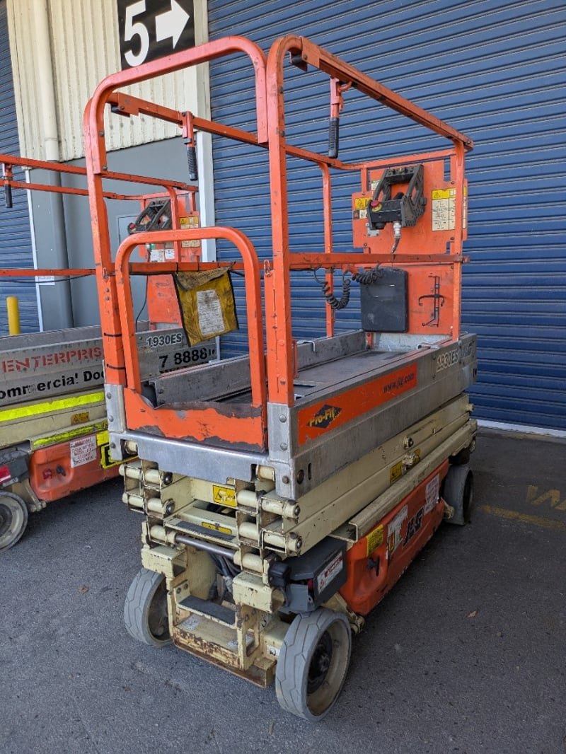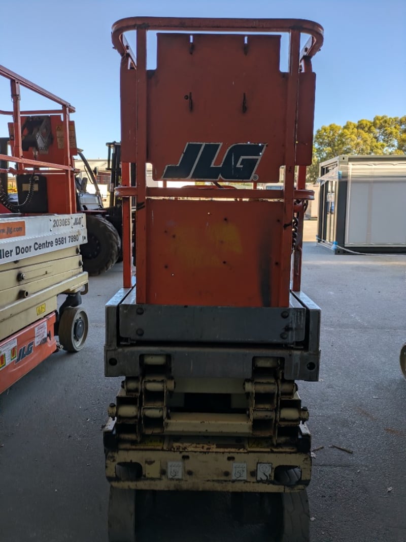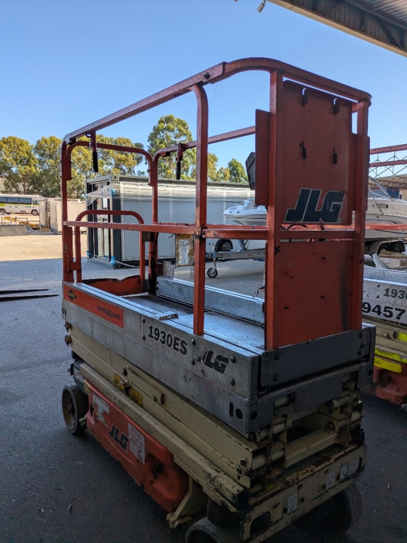 JLG 1930ES electric scissor lift presenting in used condition with cosmetic wear, surface rust and paint loss consistent with age and site use. Tyres show noticeable wear. Battery compartment, wiring, controls and safety signage present. Operational status and battery condition not tested for working order. Mechanical Inspections recommended prior to bidding.