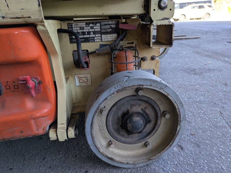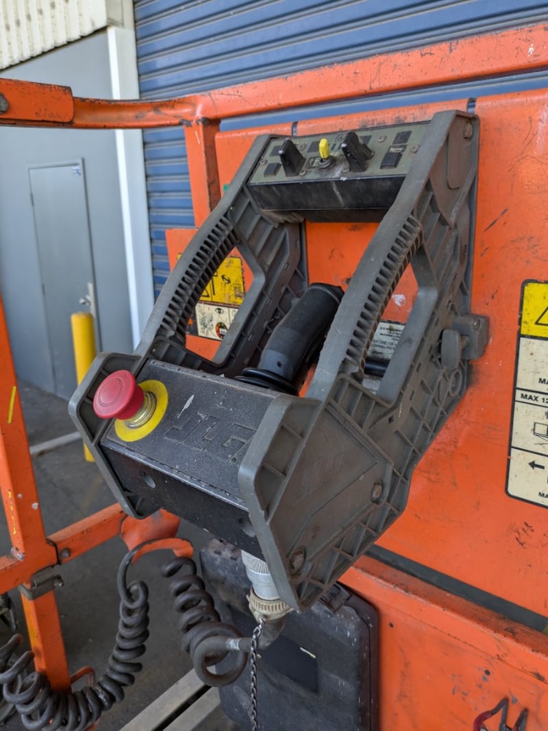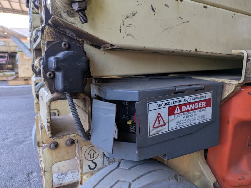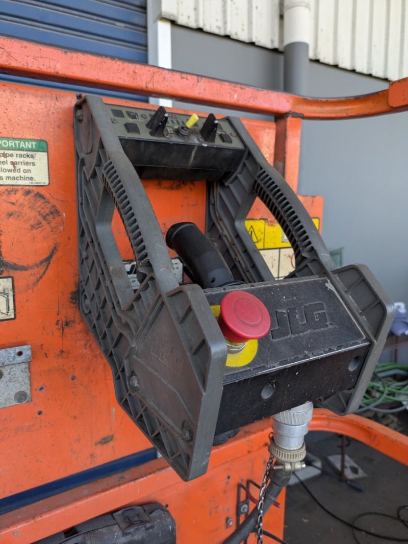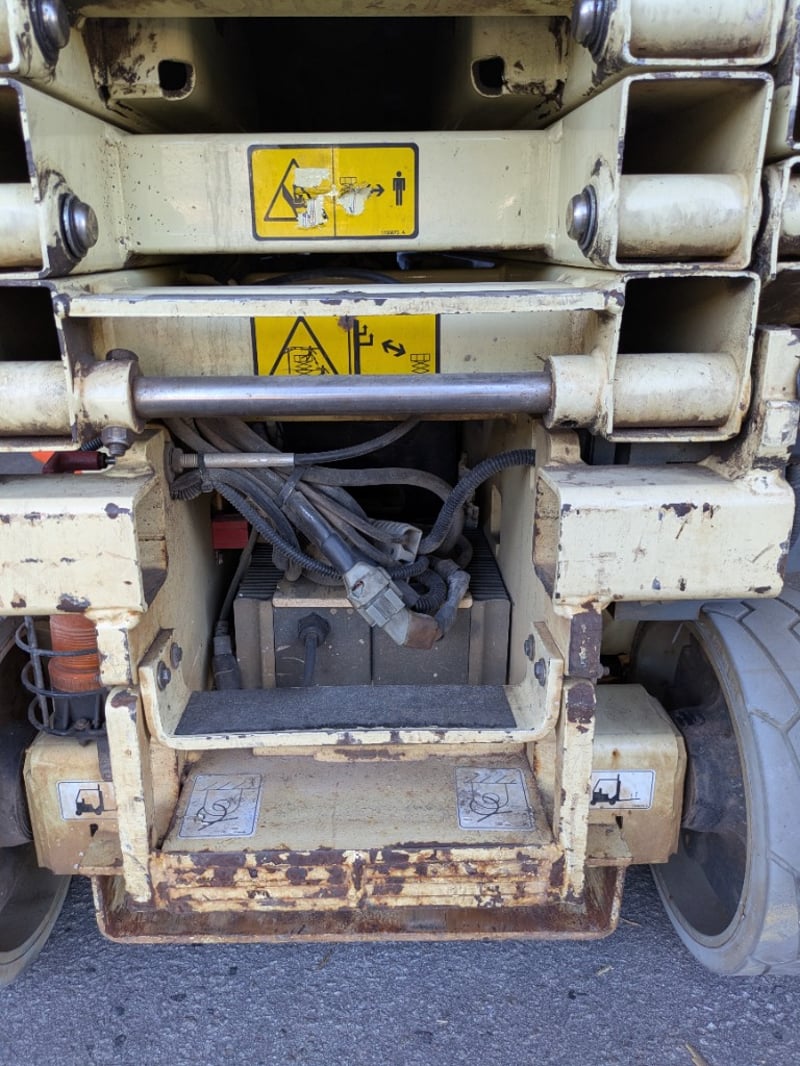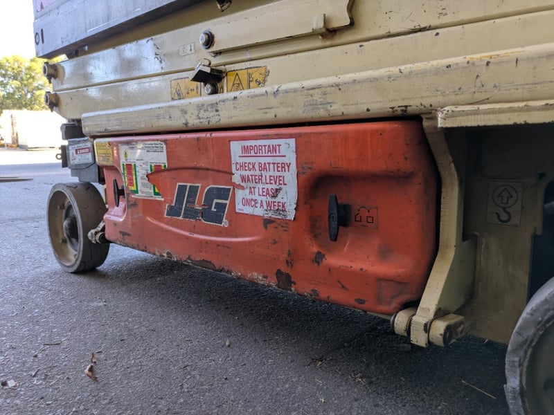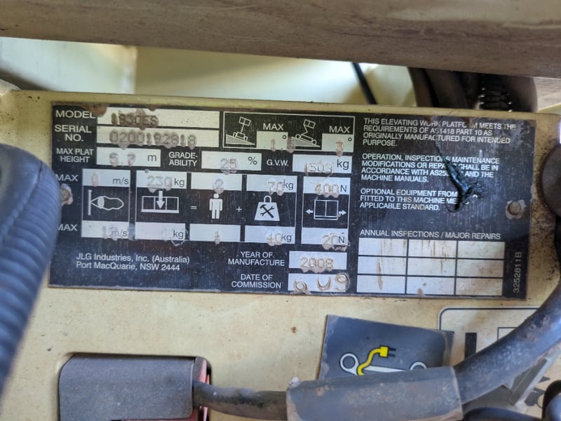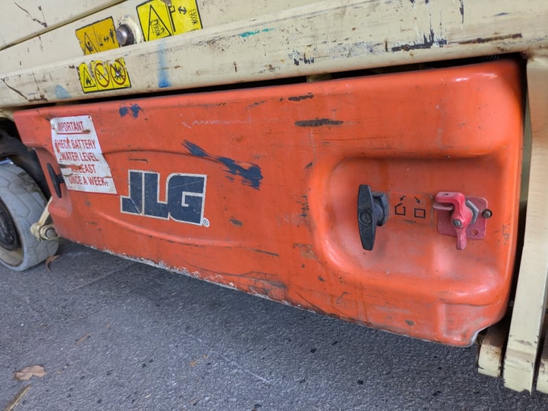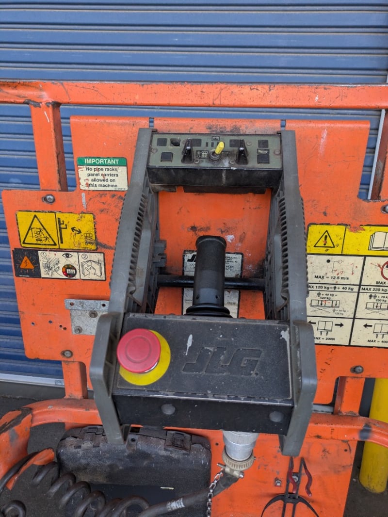 JLG 1930ES electric scissor lift presenting in used condition with cosmetic wear, surface rust and paint loss consistent with age and site use. Tyres show noticeable wear. Battery compartment, wiring, controls and safety signage present. Operational status and battery condition not tested for working order. Mechanical Inspections recommended prior to bidding.