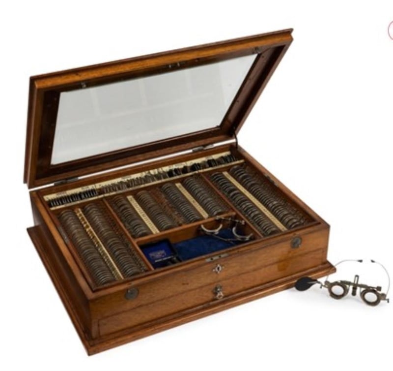 COMPLETE ANTIQUE 19TH CENTURY OAK CASED OPTOMETRIST'S LENS SET An Antique Oak Cased Optometrist'S Lens Set, 19Th Century Comprising A Full Set Of Trial Lenses And A Pair Of Examination Glasses, The Case Interior With Handwritten Labels To The Ivory Compartments; Mark Of 'Boettgers' Adelaide To Box Of Components 15Cm High, 54Cm Wide, 42.5Cm Deep Note- Otto Boettger (1842-1907) Was A Renowned Adelaide Optician And Instrument Maker 587801+2