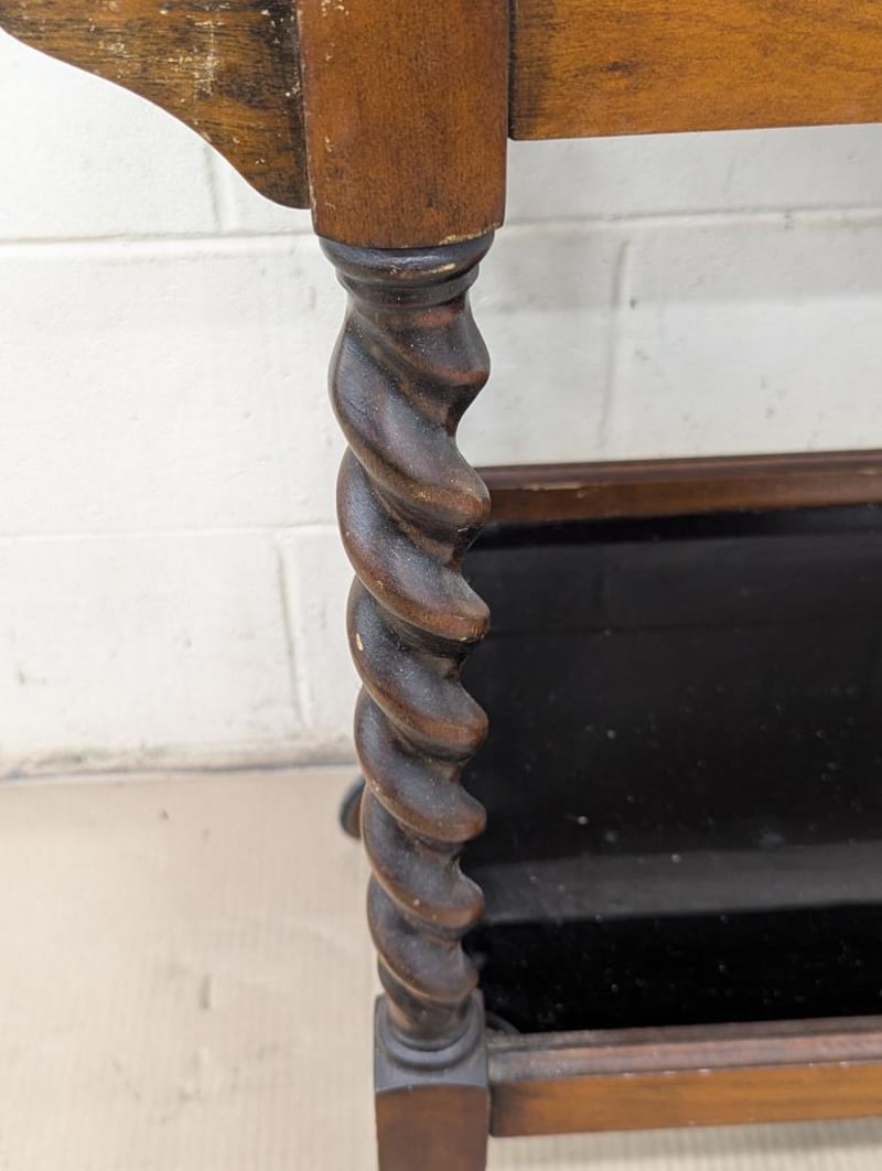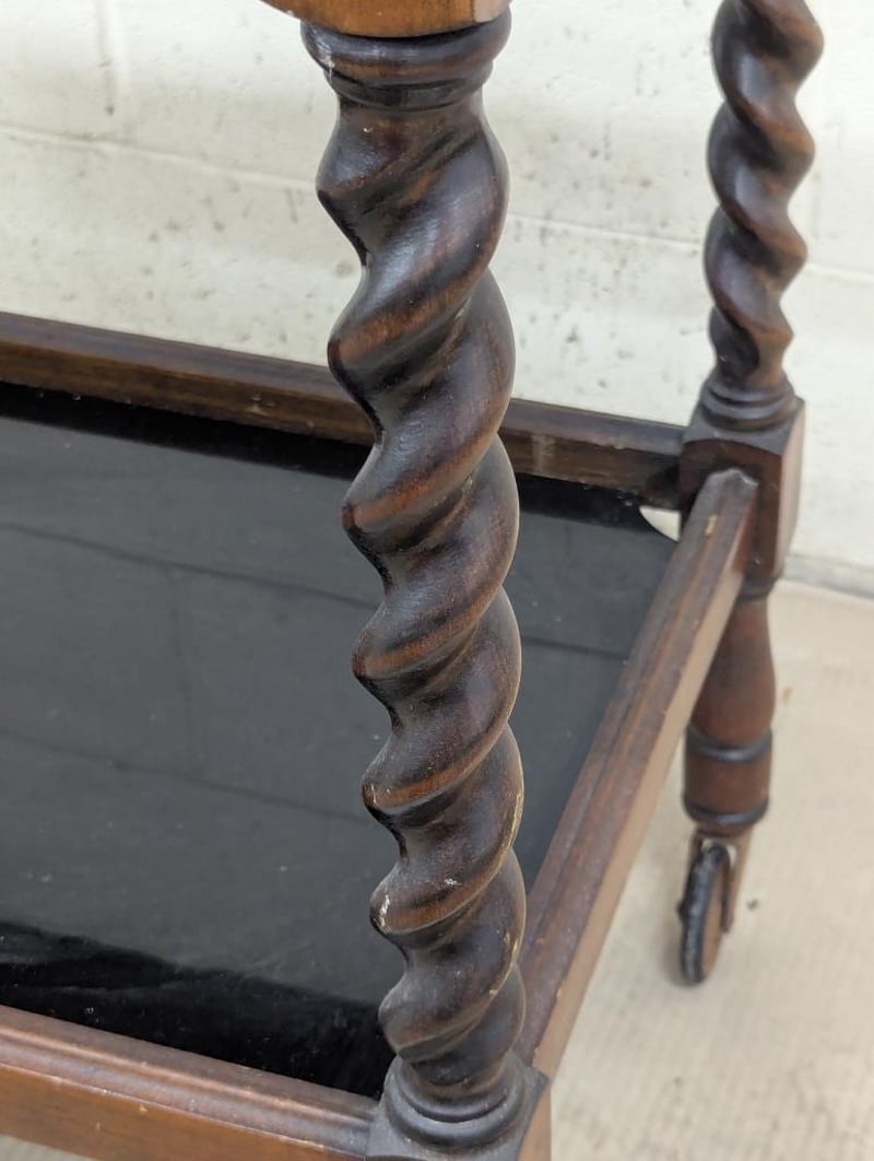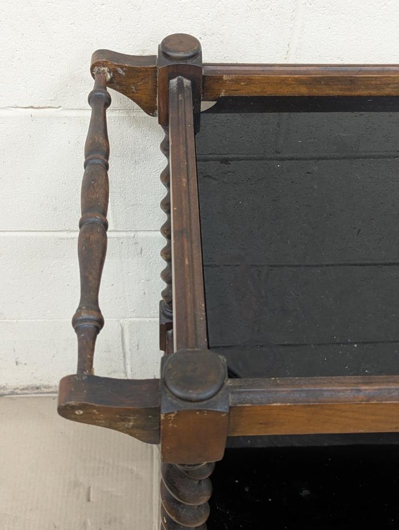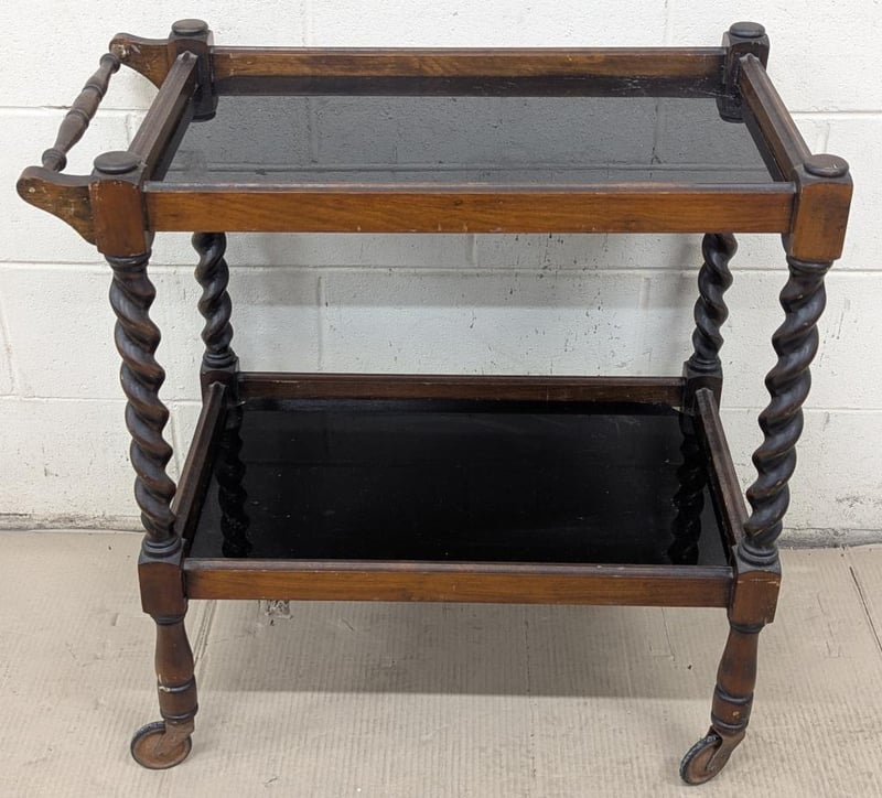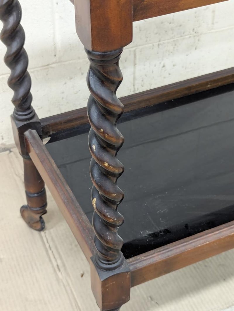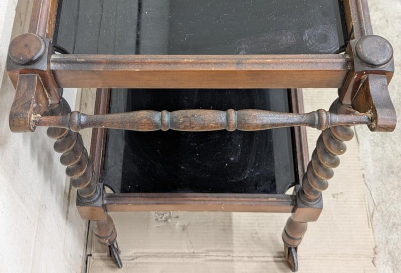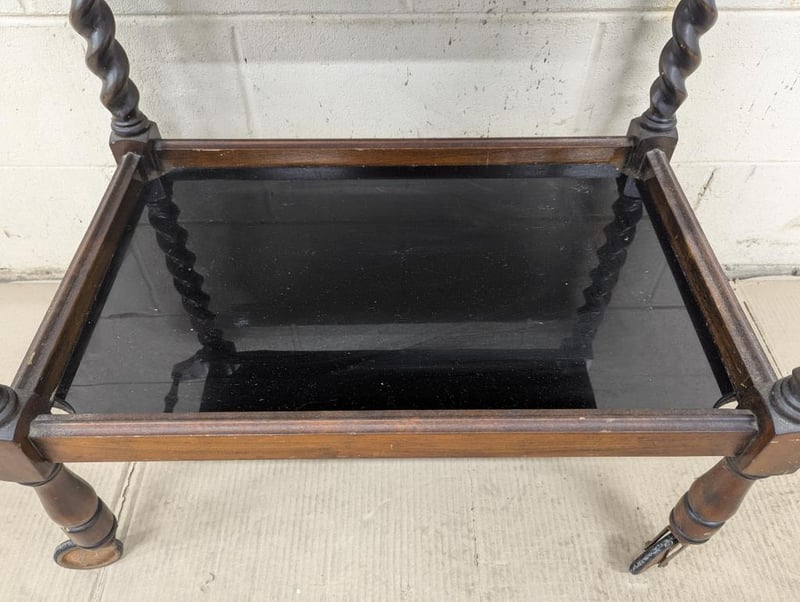 Timber Construction, Four Casters, Two Tier, Black Glass Style Shelves, Spiral Strut Design