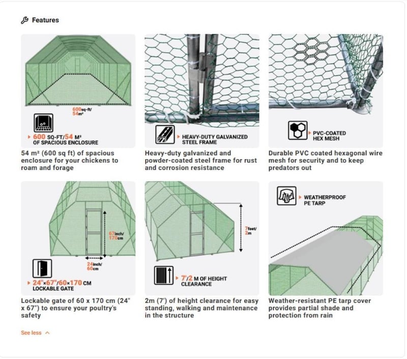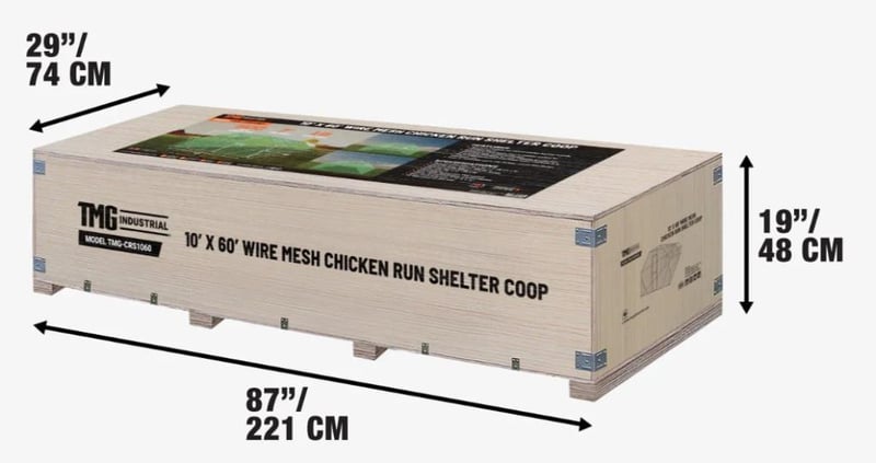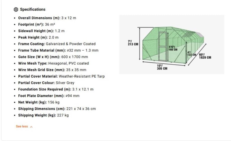 WAREHOUSE DIRECT** 3 x 18 m Chicken Coop Run Shelter with Lockable Gate, 2 m High, 54 m², TMG-CRS1060 Product Description The TMG-CRS1060 Outdoor Chicken Run offers a safe, spacious, and durable enclosure for your poultry. Its 3 m x 18 m (10' x 60') footprint provides approximately 54 m² (600 sq ft) of room for your chickens to live comfortably outdoors. Constructed from a robust galvanized and powder-coated steel frame, this chicken run is built to last in the Australian climate. The included weather-resistant PE tarp cover offers protection from the sun and rain, ensuring your poultry is comfortable in all weather. A lockable gate provides peace of mind, knowing your flock is safe and secure. Easy to assemble, this chicken run is a cost-effective and reliable solution for any poultry owner.